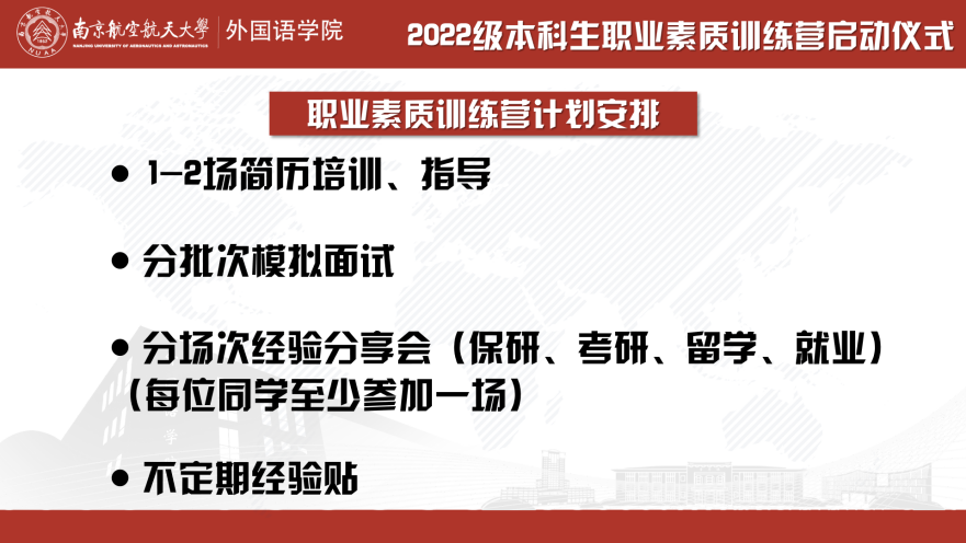 最后,朱芸为同学们详细介绍了针对大三年级的“职业素质训练营”计划安排,包含简历培训与指导、分批次模拟面试、分场次经验分享会、不定期经验贴等。希望职业素质训练营能够为大三年级学生在关键阶段提供清晰的指引与切实的帮助,激励他们以明确的目标和饱满的热情迎接未来的挑战。