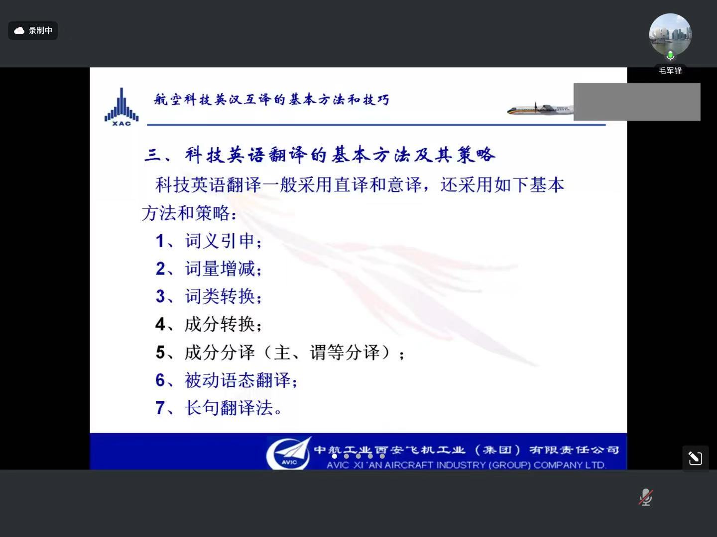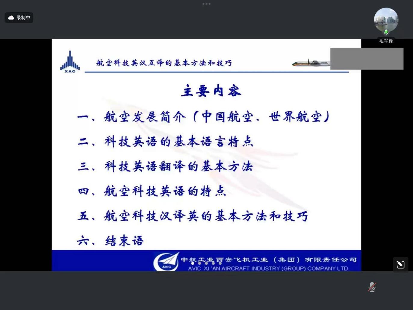 在讲座中,毛译审首先梳理了中外航空发展史,然后分析了科技英语的基本语言特点,并分享了航空科技英语翻译的基本方法和技巧。在中外航空发展史部分,毛译审全景式回顾了人类航空发展史与中国航空工业的辉煌成就,重点介绍了人类航空史的一些重要事件:从战国时期的风筝升空到18世纪热气球载人飞行,再到莱特兄弟首架飞机问世;从新中国歼-8突破音障到当下歼-20隐身战机翱翔苍穹。毛译审强调,中国航空工业的跨越式发展,以运-12通航传奇、翼龙无人机领跑全球、C919打破垄断为代表的重大成就,都离不开无数科技翻译工作者搭建的知识桥梁。