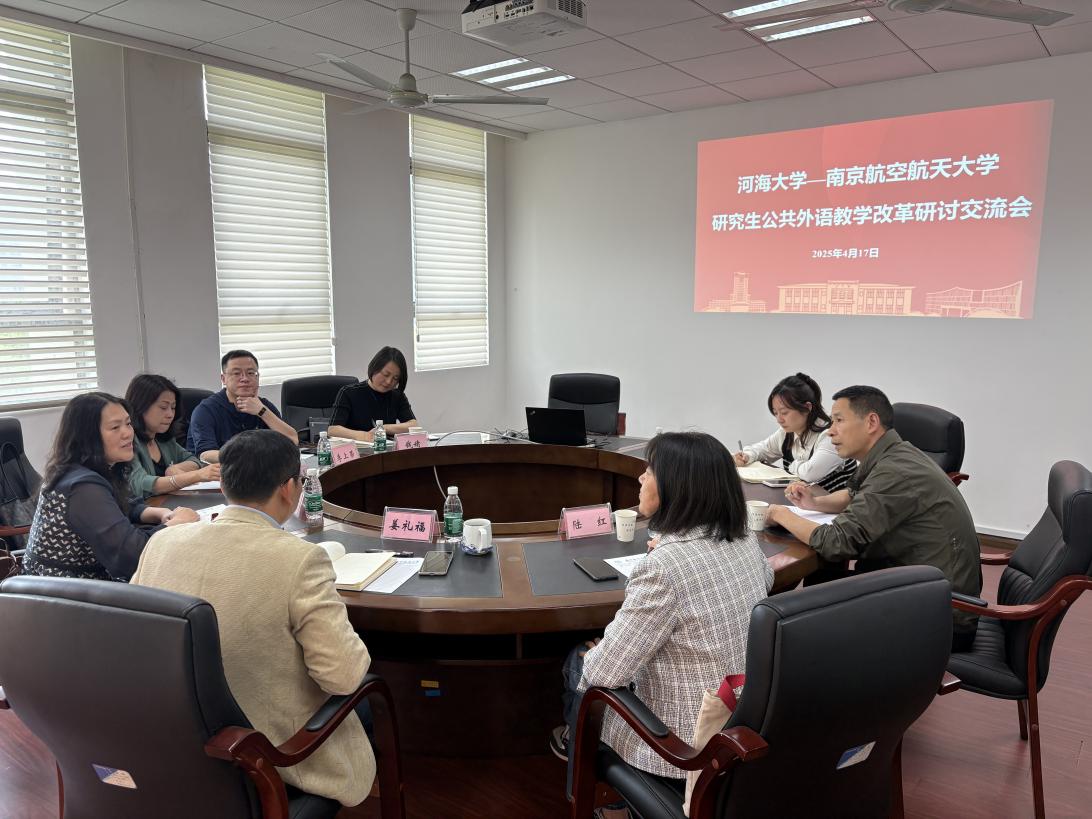 2025年4月17日下午,河海大学必赢国际437官网副院长董桂君一行访问我院,开展南京航空航天大学-河海大学研究生公共外语教学改革研讨交流会,我院副院长姜礼福、研究生公共外语教学部主任陆红及相关负责人出席并参与研讨。