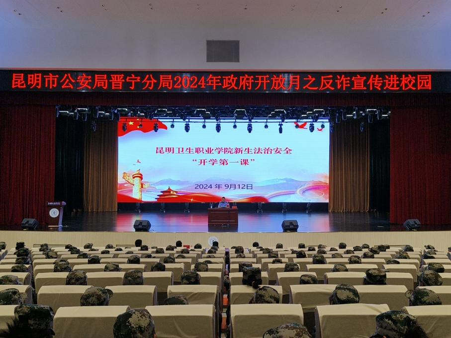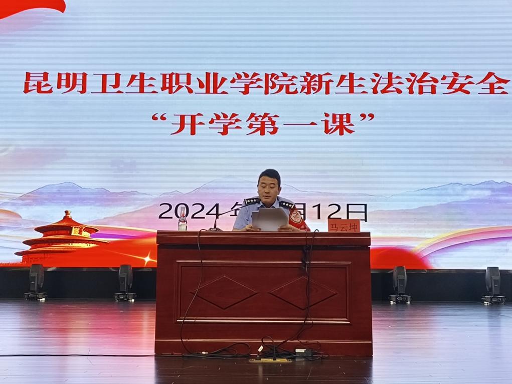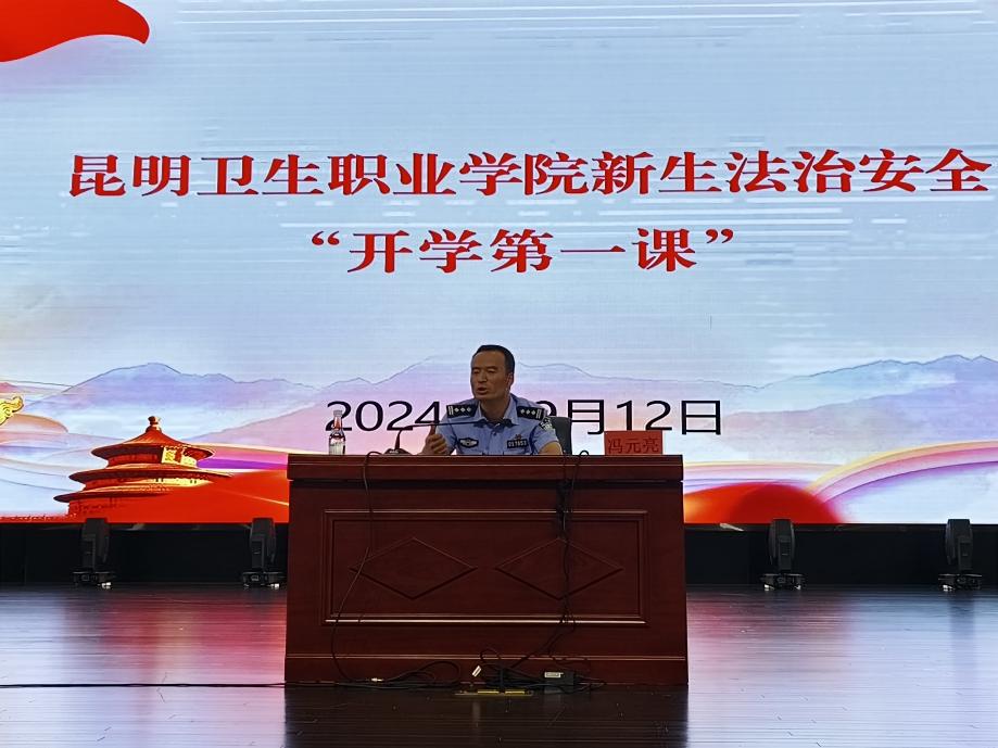 为进一步提高2024级新生的法治观念,提高学生自身安全保护意识,继续做好学生的安全管理。大学生工作部联合昆明市公安局晋宁分局于2024年9月12日在明德会堂开展新生法治安全第一课讲座。