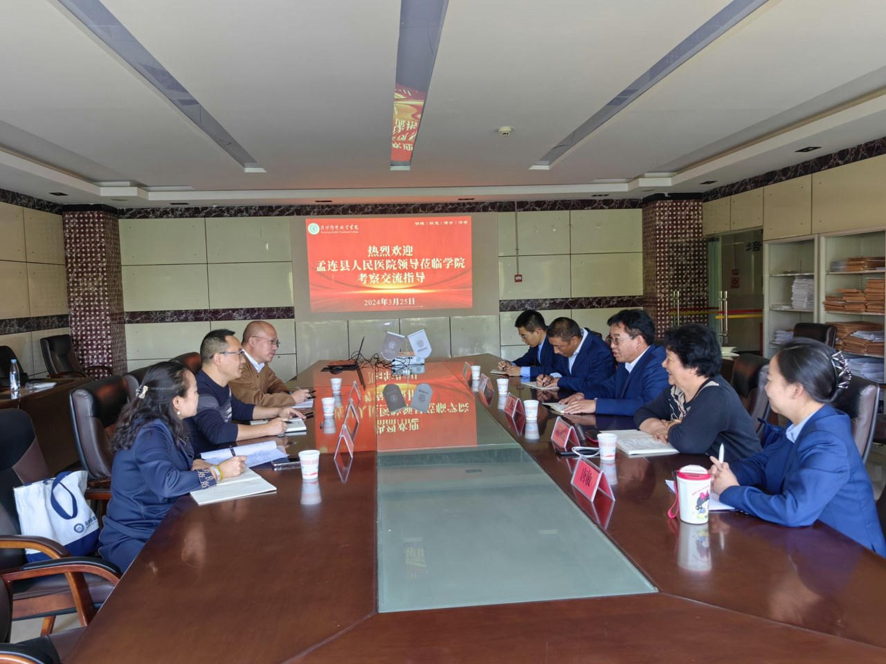 2024年3月25日,孟连县人民医院院长李建斌,常务副院长邹岷,人力资源科主任叶翁一行到今年会官方网站进行考察交流学习。参加此次交流会的有今年会官方网站副院长张尤松,护理学院院长蒋淑昆,临床学院副院长唐敏,教务处处长孟州令,实习管理处副处长颜慧林。
