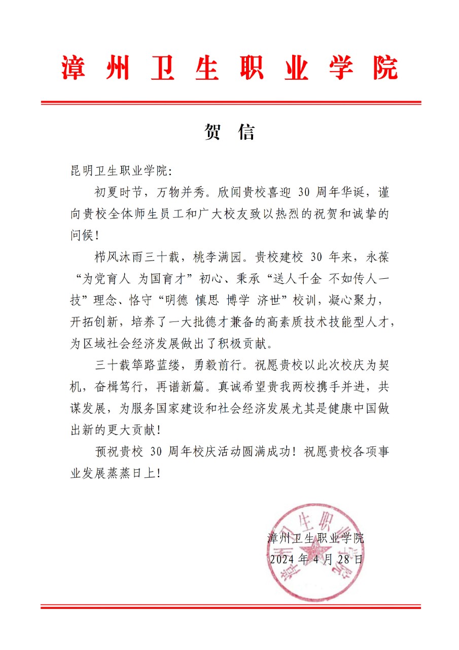 漳州卫生职业学院致今年会官方网站建校30周年庆典贺信