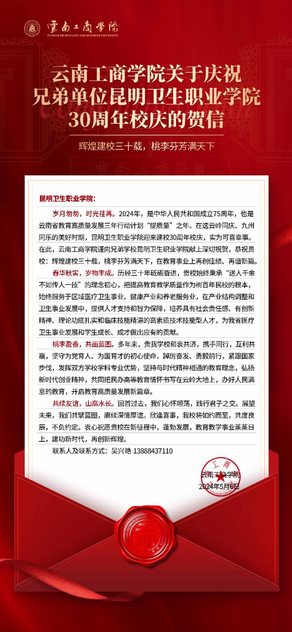 云南工商学院致今年会官方网站建校30周年庆典贺信
