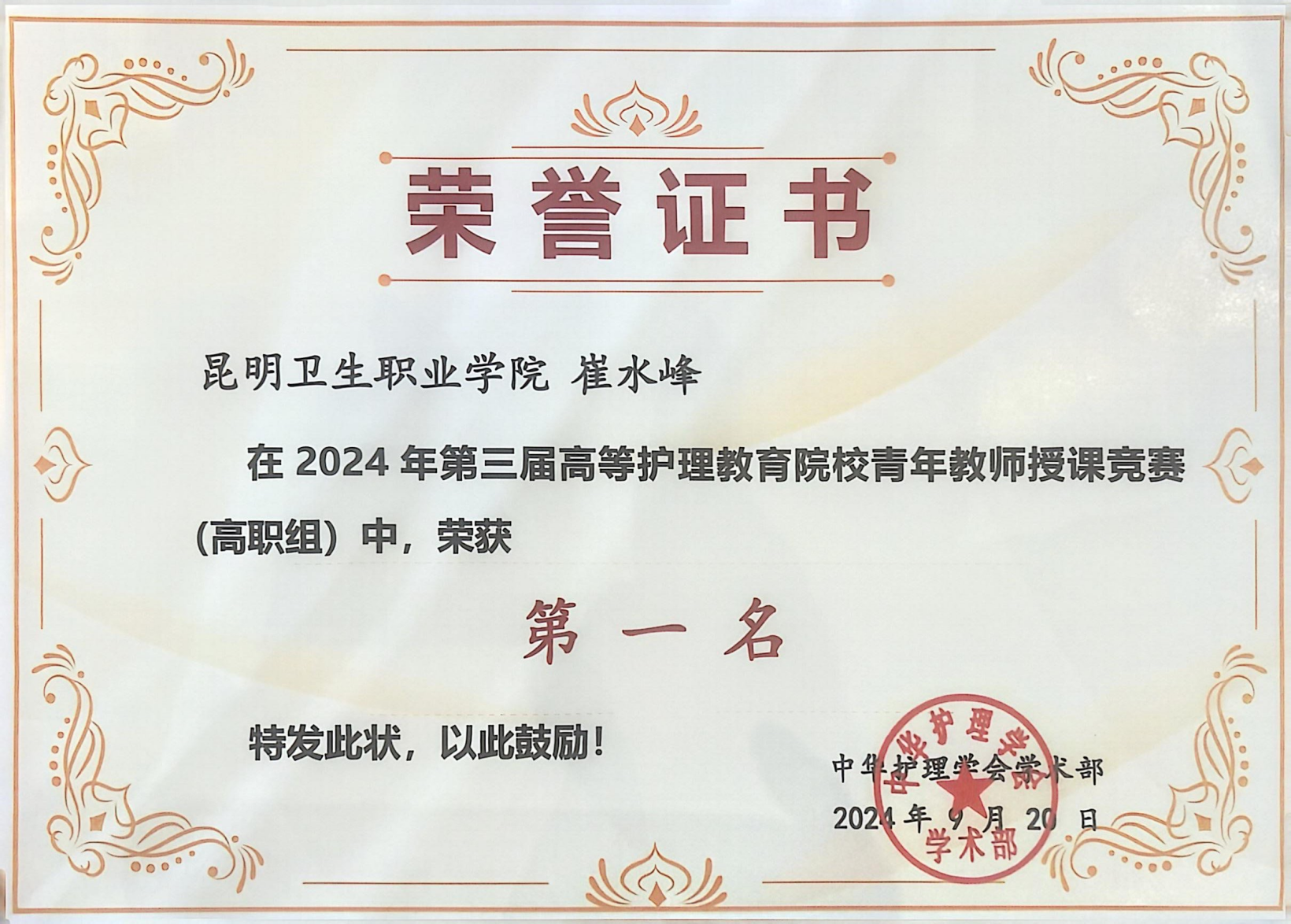 2024年9月20日至23日,由中华护理学会主办、福建省护理学会协办的2024年第三届高等护理教育院校青年教师授课竞赛在厦门圆满落下帷幕。今年会官方网站护理学院教师崔水峰以《毒蛇咬伤现场急救》为参赛教学内容,凭借其新颖的教学方法和独特的教学魅力,在众多优秀教师中脱颖而出,荣获高职组第一名的佳绩。