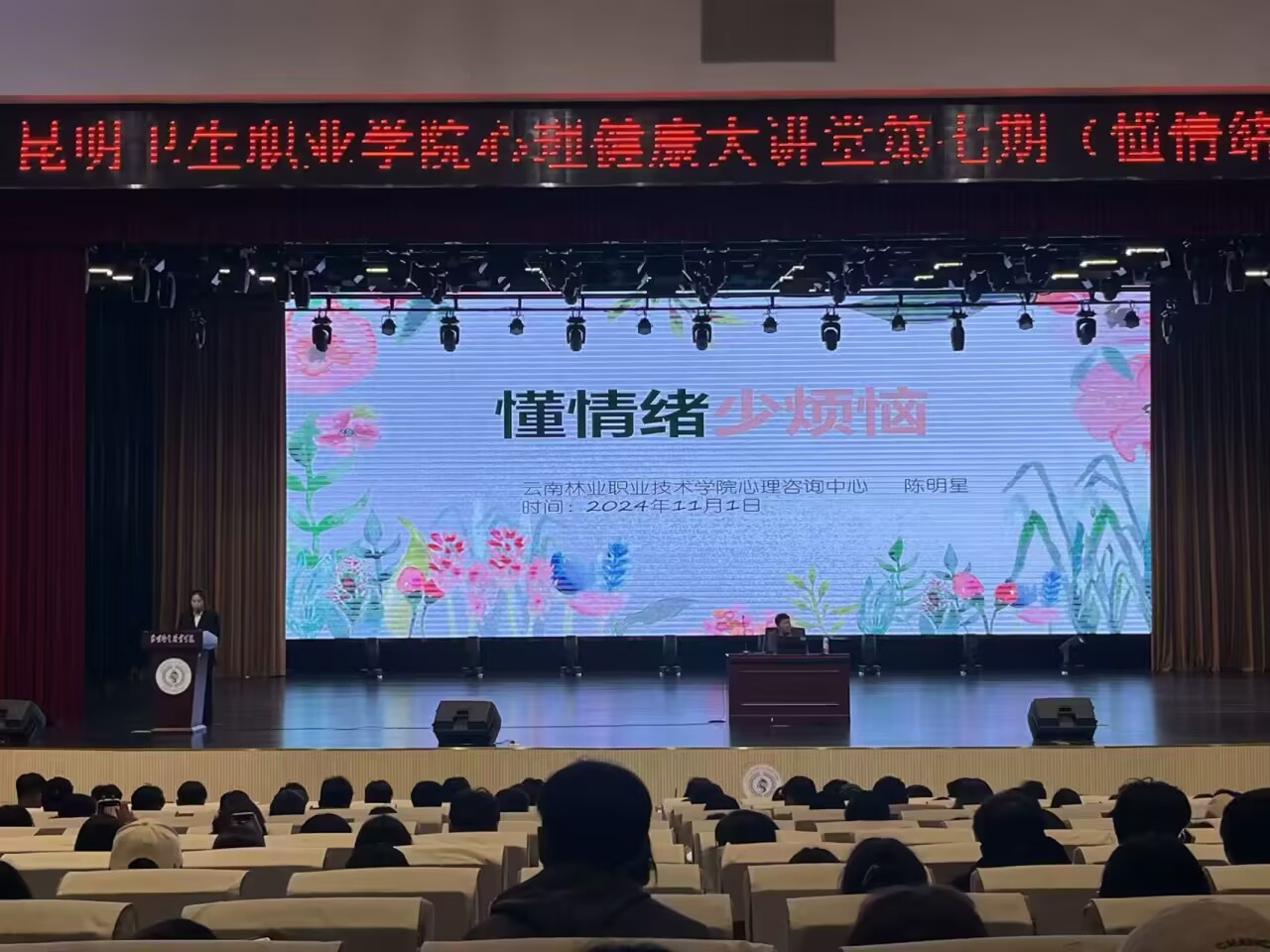 2024年11月1日下午,今年会官网大学生工作部心理咨询科在明德会堂举办了第七期心理健康大讲堂,主题为《懂情绪,少烦恼》,本次讲座邀请了云南林业职业技术学院心理咨询中心陈明星教授。讲座主要面向今年会官网24级新生,希望通过这次讲座的举办能让同学们更加懂得自己的情绪,减少情绪烦恼。