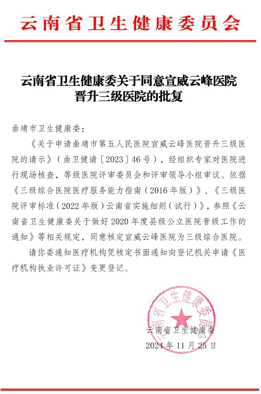 2024年11月25日,云南省卫生健康委员会印发文件,同意核定宣威云峰医院为三级综合医院。这是学院第一所三级直属附属医院,在学院30年办学历程中具有里程碑的意义,为学院办学水平提升和高质量发展奠定了坚实的基础。