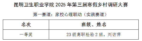 为深入学习贯彻习近平新时代中国特色社会主义思想,积极响应党的二十大精神,引导青年学生在社会实践中锤炼思想、锻炼成长,心理咨询科于2025年寒假期间成功举办了“第三届寒假返乡调研报告征集大赛”。本次活动以乡村心理健康为主题,设置了家校心理联动与乡村心理卫生调查两大赛道,吸引了全校同学的广泛参与,涌现出一批高质量的调研作品。此次获奖同学名单如下: