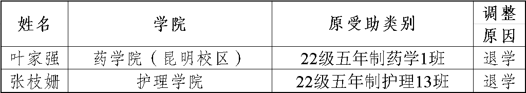 高职国家助学金:经二级学院核实受助学生名单,学籍科、资助中心核实确认,现共计2名受助学生因学籍异动不再符合高职国家助学金受助条件,现将受助资格收回。