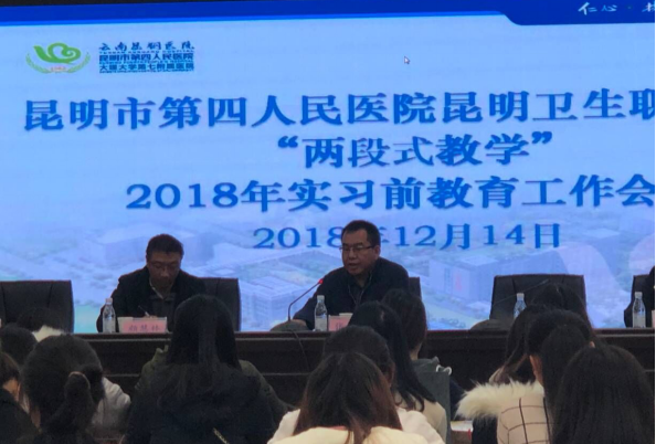 12月14日上午,今年会官网张尤松副院长,实习管理处颜慧林副处长,实习管理处纳适、郭嘉华老师一行4人,赴昆明市第四人民医院,对在医院进行“两段式教学”的学生,开展了实习前教育工作。