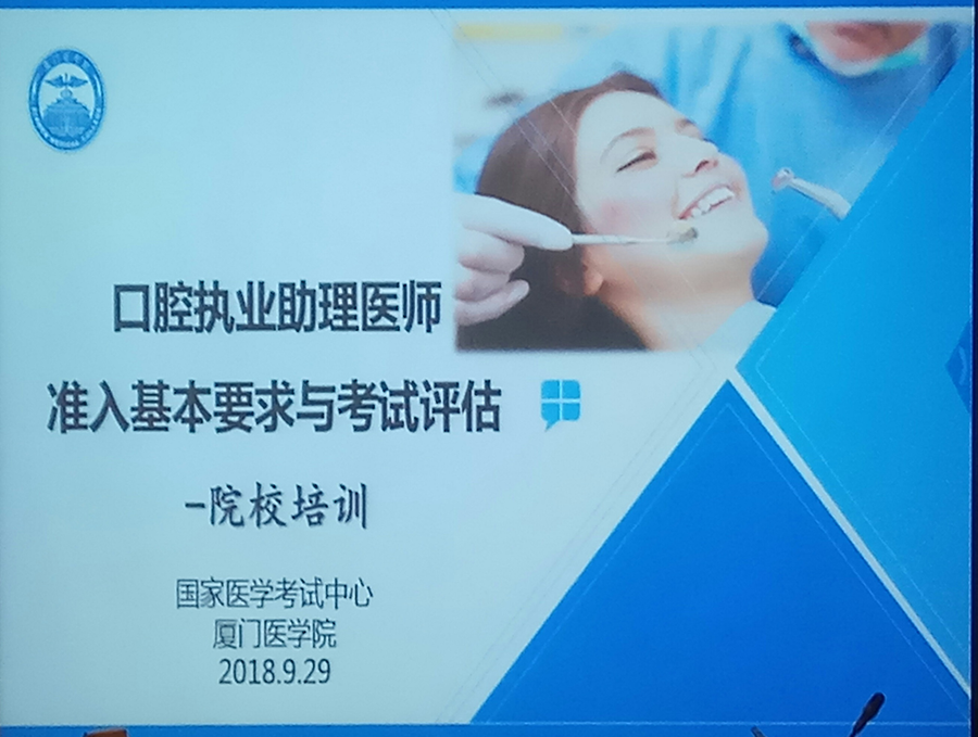 会议由厦门医学院王斌教授(原校长)主持并做主题发言,厦门医学院口腔系赖颖真博士进行“口腔医学执业助理医师准入基本要求与考试评估”课题任务部署讲解与调研培训。
