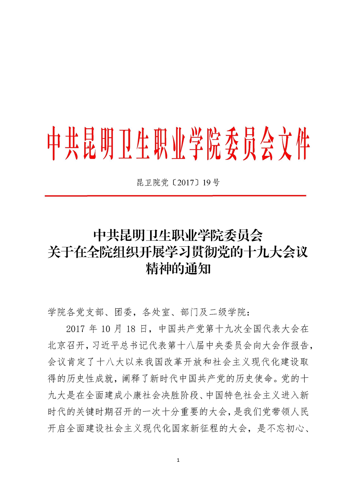 关于在全院组织开展学习贯彻党的十九大会议精神的通知