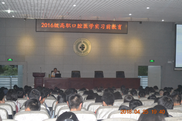 4月25日晚,2016级口腔医学专业临床实习前教育会议,在高职院学术报告厅召开。张尤松副院长,实习管理处颜慧林副处长、郭嘉华老师,出席了此次会议。