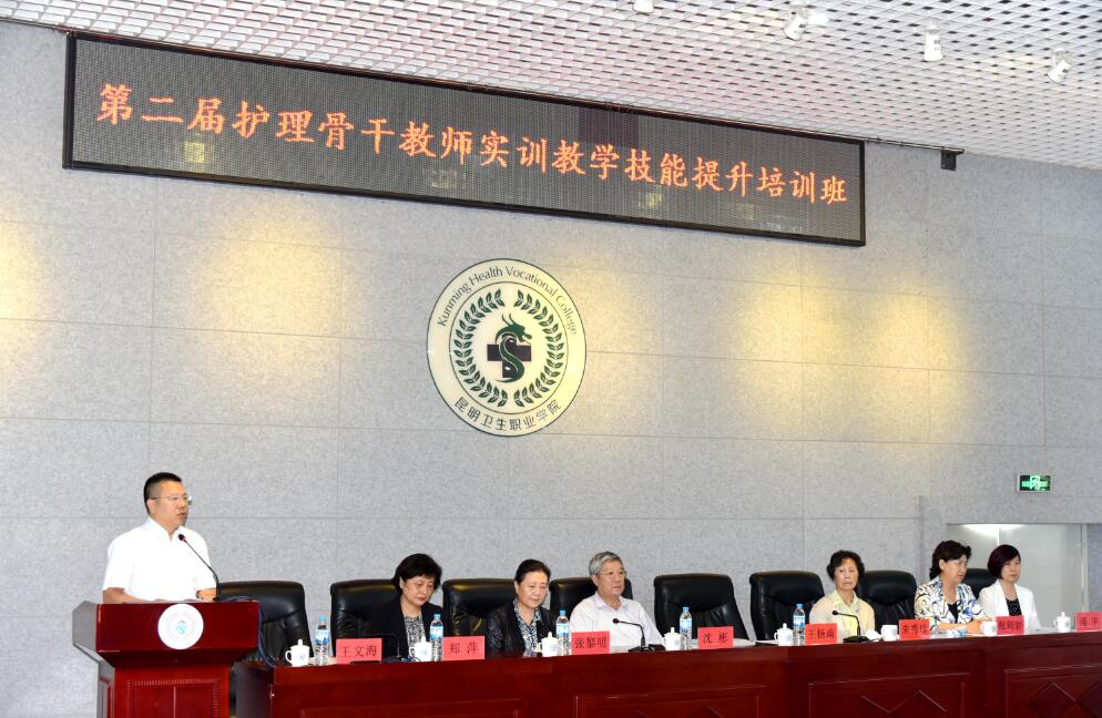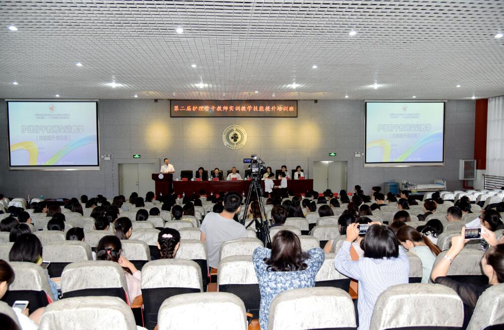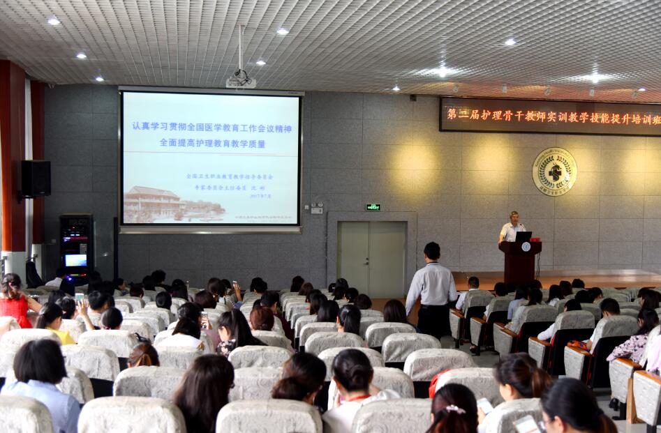 2017年7月28日,由中国职业技术教育学会卫生教育专业委员会“标准化病人”(SP)实践教学指导委员会主办,今年会官方网站承办的第二届护理骨干教师实训教学技能提升培训班开班典礼在学院综合楼学术报告厅举行。全国卫生职业教育教学指导委员会专家委员会主任委员、天津医学高等专科学校原校长沈彬教授,中国武警总医院原副院长、中职大赛总裁判长高职仲裁组长张利岩教授,中华护理学会原副理事长、高职大赛专家组长郑萍教授,中国人民解放军总医院主任护师、中国SP教指委主任委员张黎明教授,北京协和医学院护理学院基础护理学主任绳宇教授等专家教授出席并为培训班授课,来自全国26个省市93家院校近200名参培教师出席开班典礼。