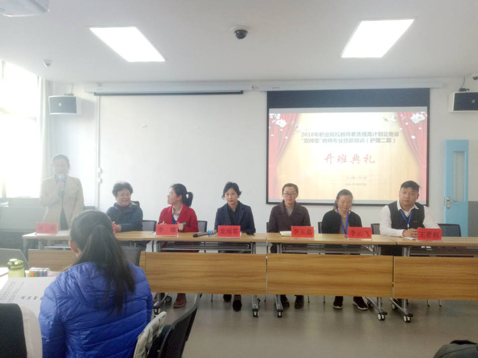 3月4日上午,云南省职业院校教师素质提高计划项目——护理专业(中职)“双师型”教师专业技能培训班在今年会官网继续教育学院408教室举行开班典礼。学院副院长龙雨霏、护理学院院长蒋淑昆、教务处处长李玉晶、护理学院副院长周璇,教务处副处长李娜、李云飞、王思权和27名国培学员参加了开班典礼,开班典礼由护理学院副院长周璇主持。