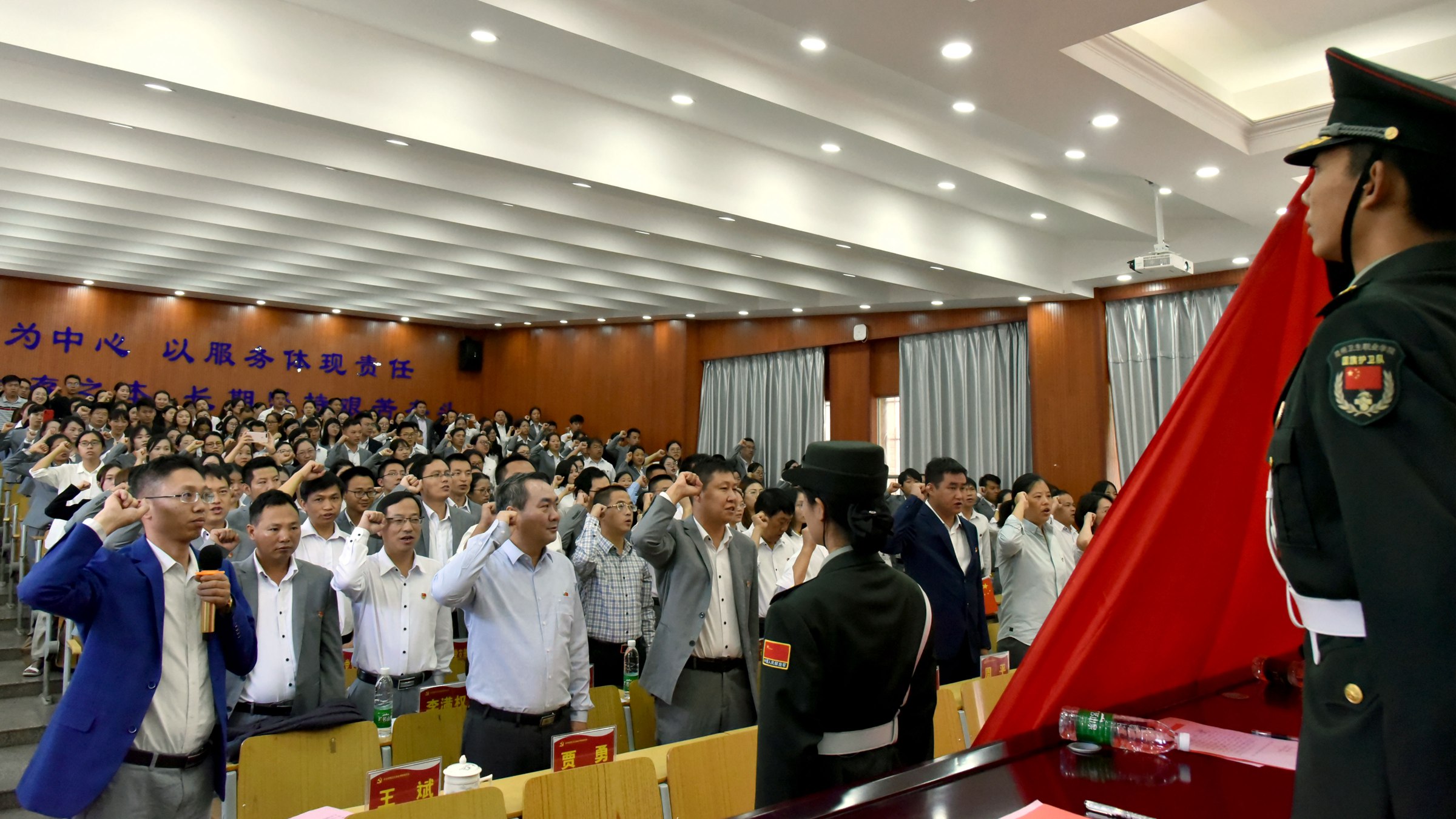 党委副书记、组织部部长张晓刚宣读了党委关于接收钱学锦、蒋新艾等60位同志为中共预备党员的审批意见。各党支部负责人为预备党员佩戴党徽,与会预备党员在党委委员、宣传统战部部长王斌同志带领下进行入党宣誓,其他与会党员重温入党誓词。