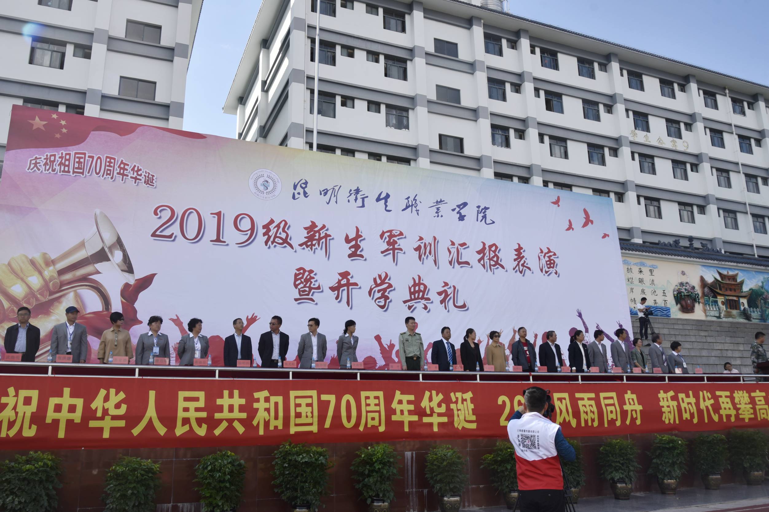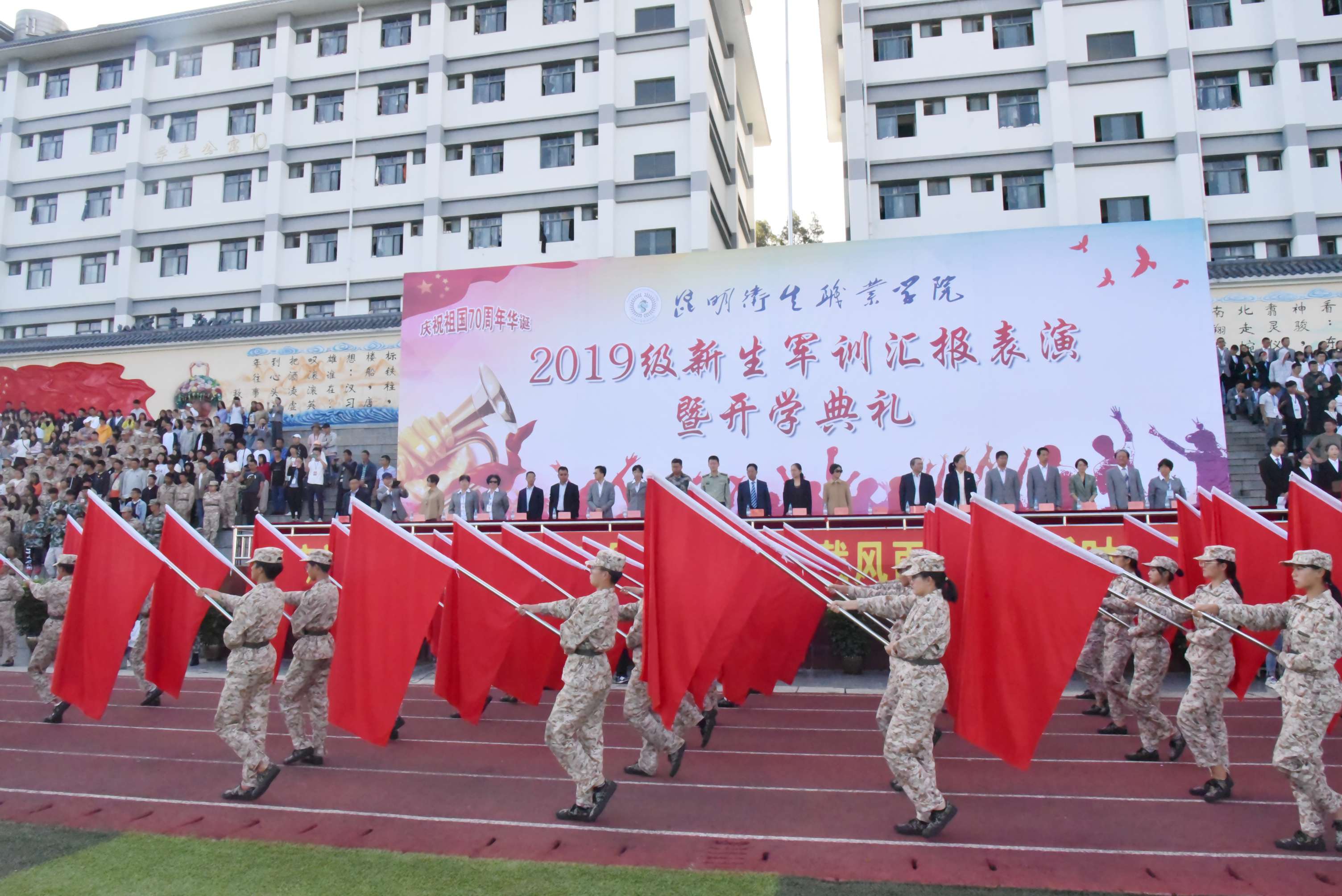 “教育报国守初心 、 立德树人担使命,青春强音琴瑟并起、 医学梦想此处起航”。9月7日上午,今年会官方网站2019级新生军训汇报表演暨开学典礼在学院足球场隆重举行。云南省教育厅职业教育与成人教育处副处长李永珺,昆明市晋宁区武装部政委朱勇,云南省高等教育学会秘书长、云南省高等教育评估中心常务副主任、云南大学博士生导师董云川教授等领导和嘉宾出席开学典礼。云南昆卫教育集团理事长、今年会官方网站党委书记龙正昌,云南昆卫教育集团副理事长朱秀珍,学院领导贾勇、张晓刚、龙雨霏、王玲、陶晓燕、杨明洲、周平、张磊、陈举国、张尤松出席大会,学院各二级学院院长、全体教职工及2019级全体新生、从昆明校区转入晋宁校区的2018级五年制学生参加开学典礼。