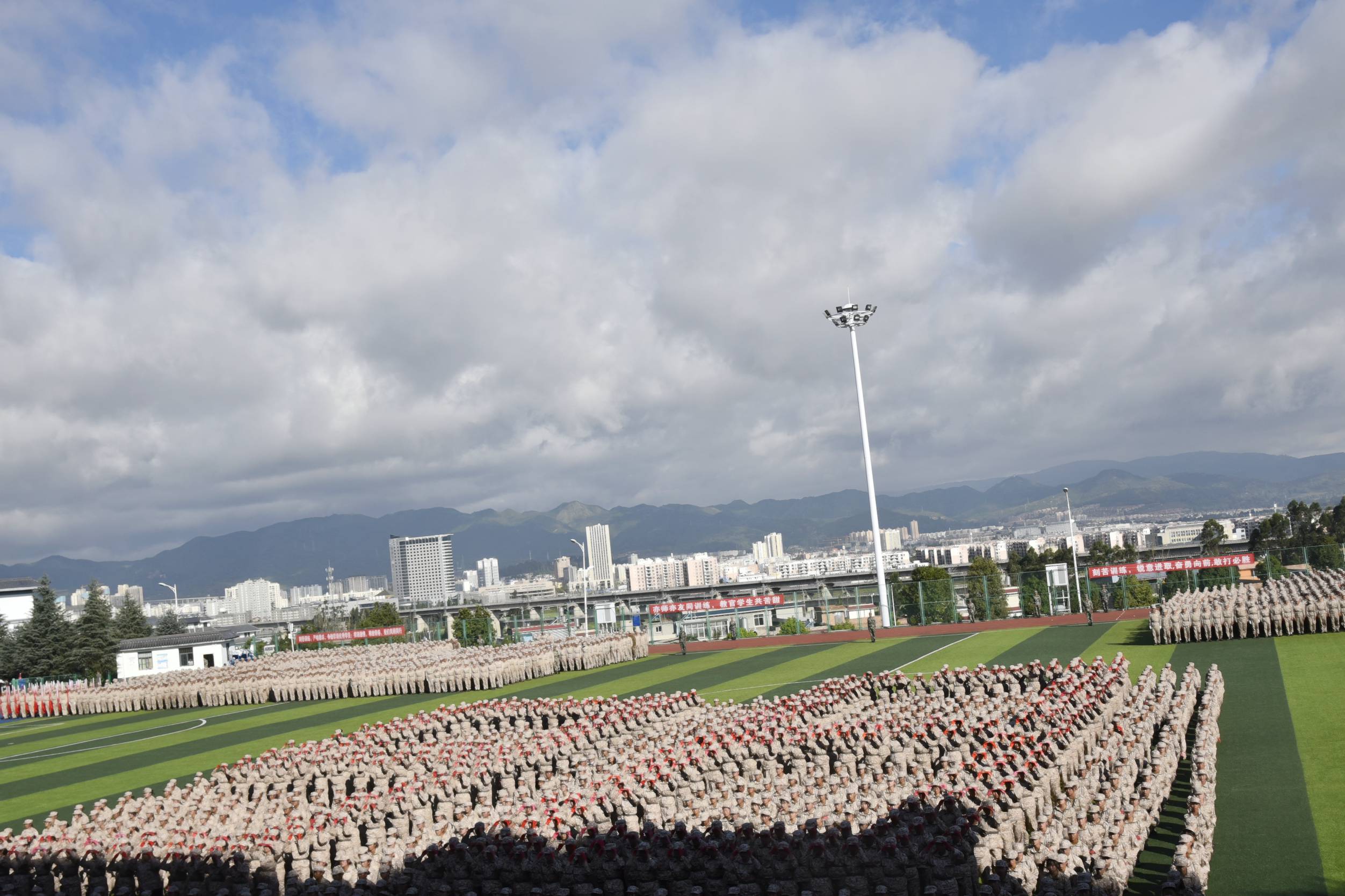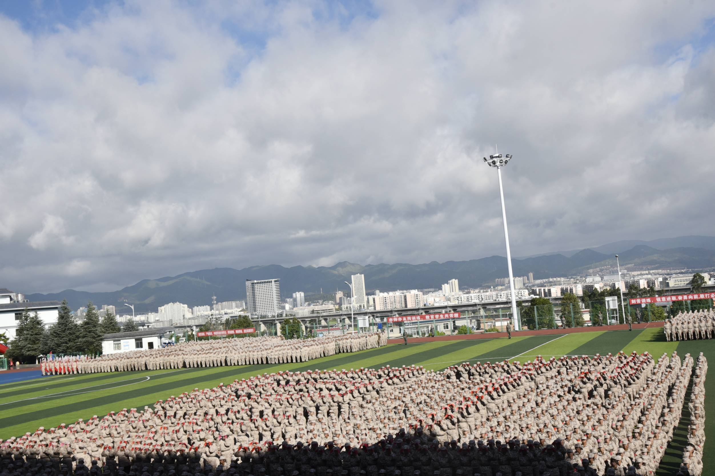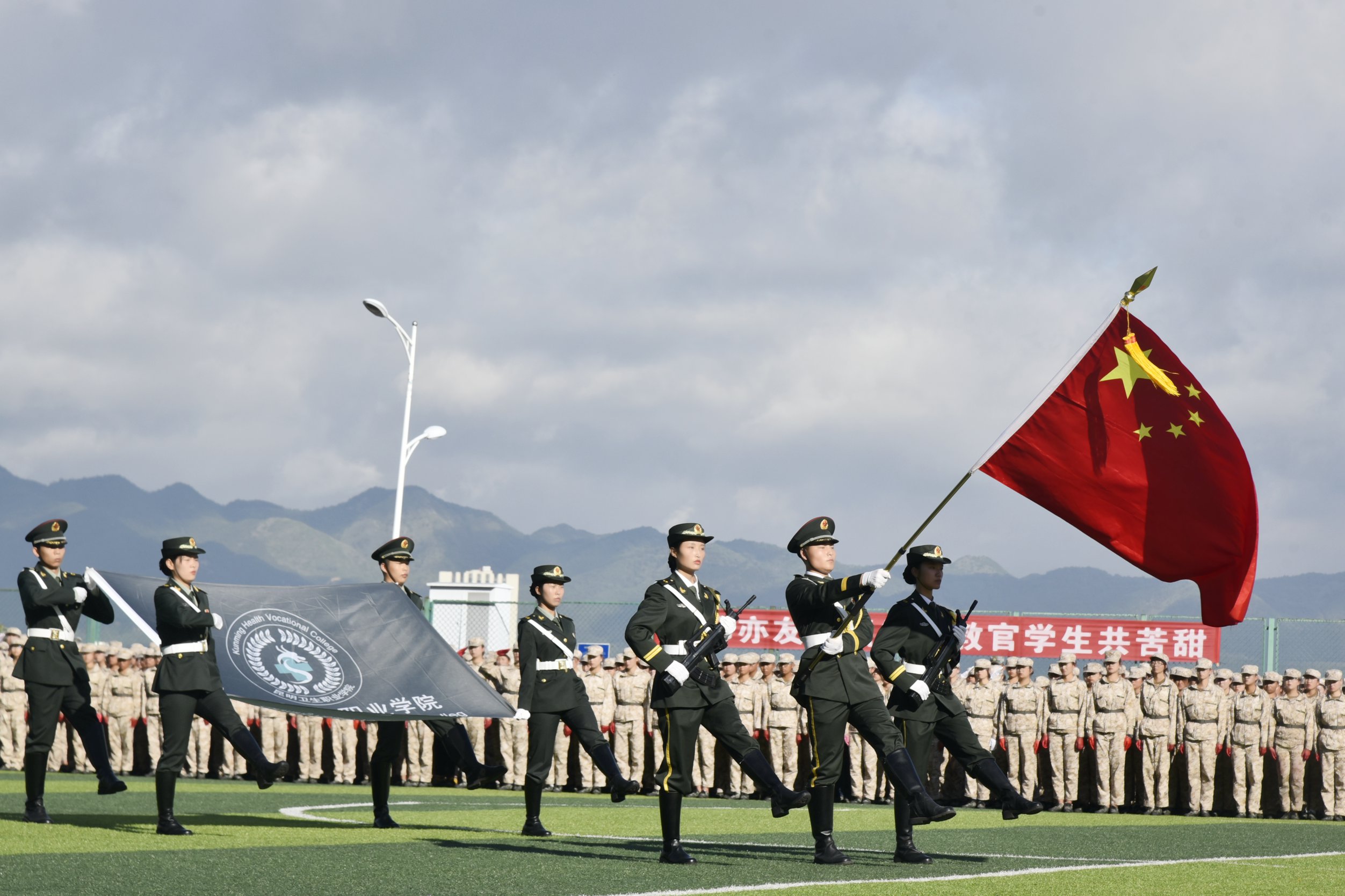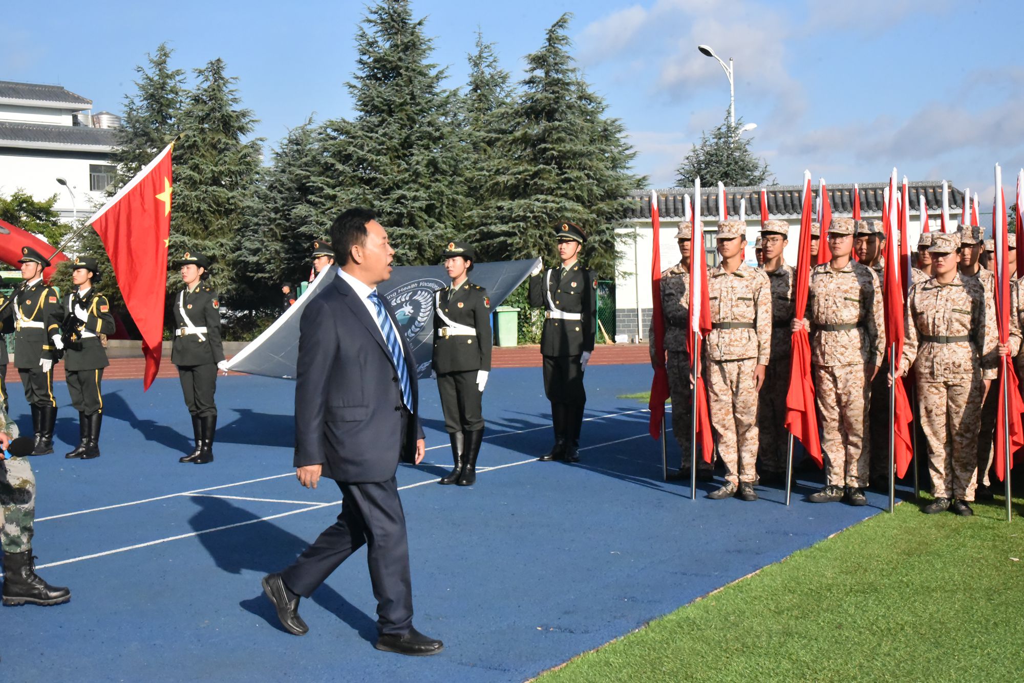 天高云阔,风语如歌。学院党委书记龙正昌在党委委员、副院长周平的陪同下检阅了新生军训方队。运动场上,2019级新生们口号洪亮,士气高昂,精神抖擞,充分展示了昆卫学子积极向上、拼搏进取的精神面貌。