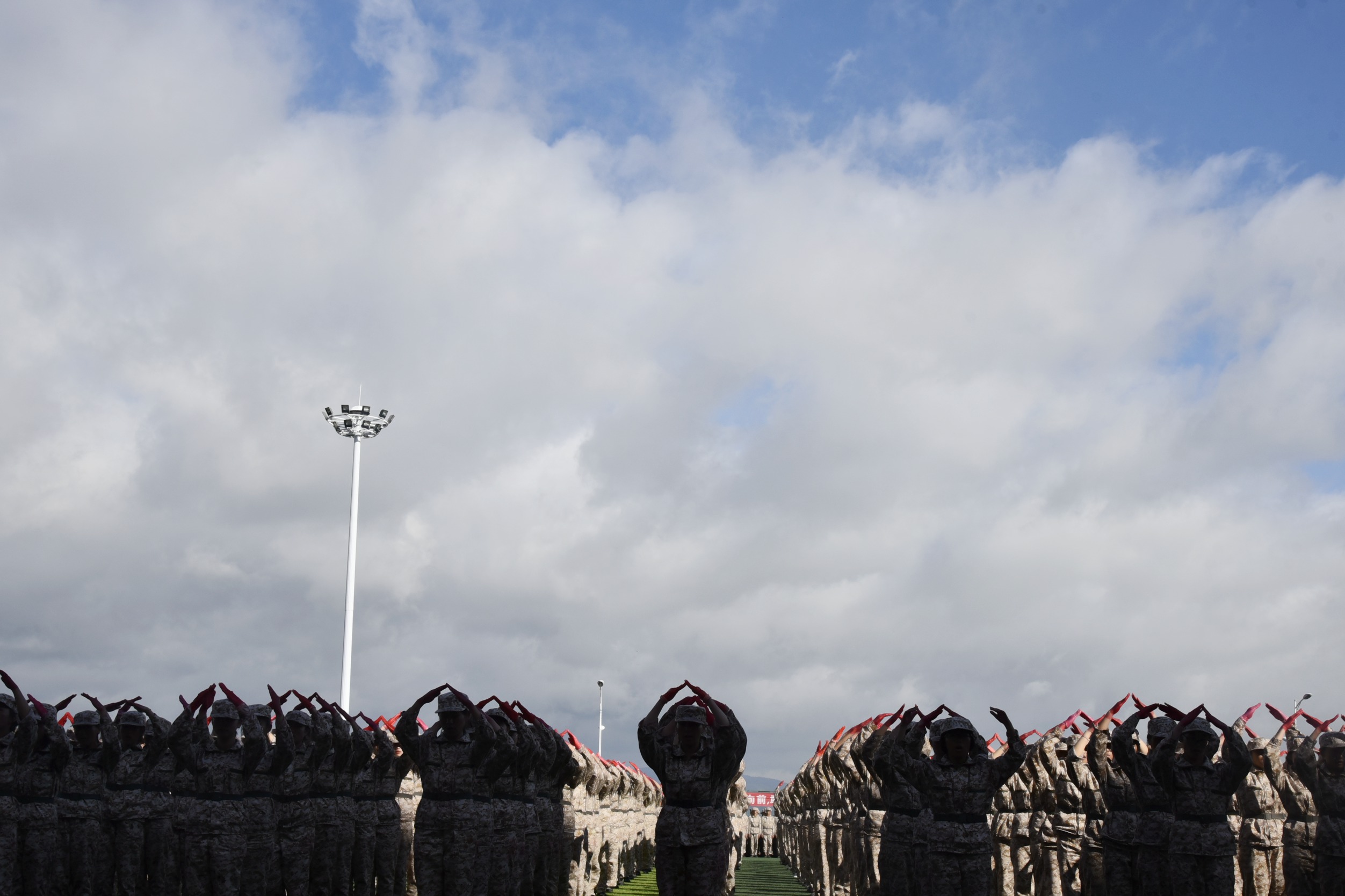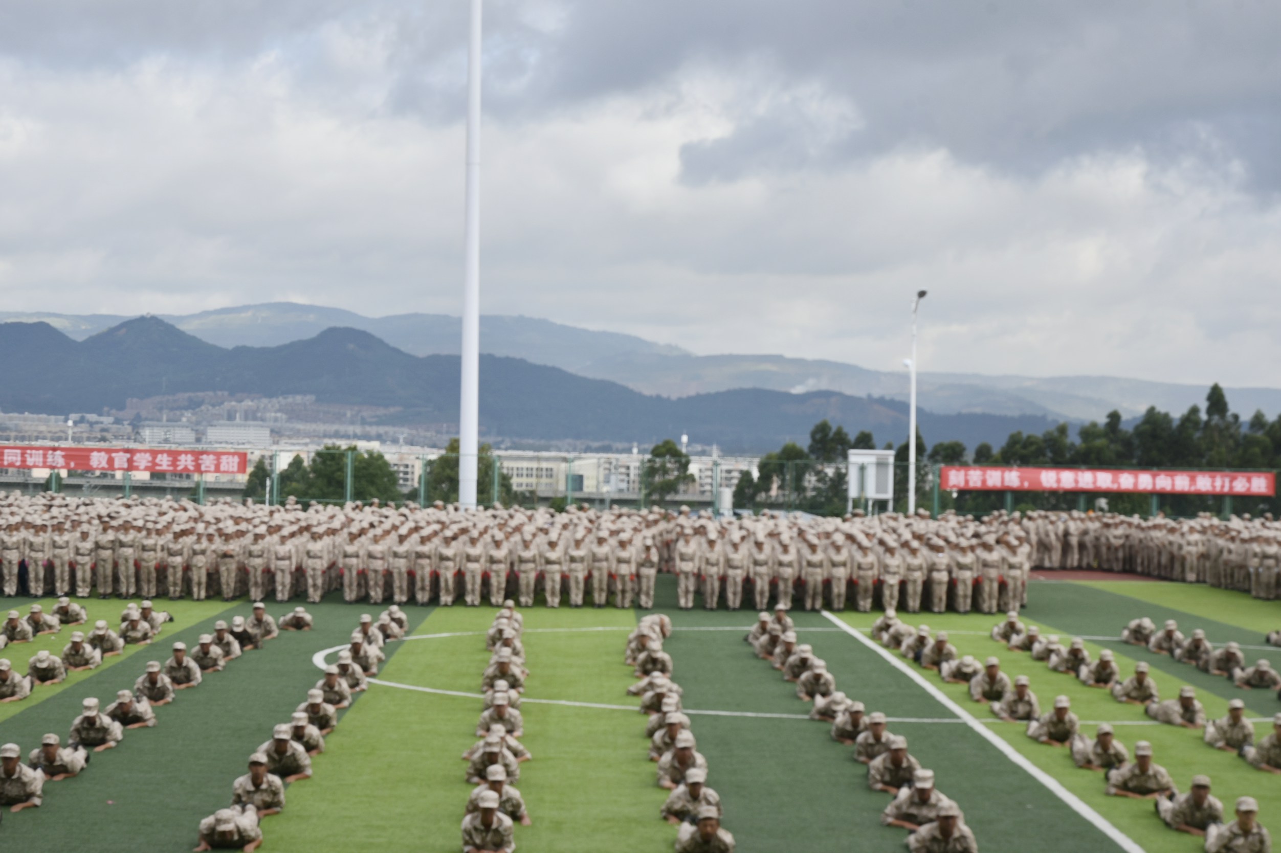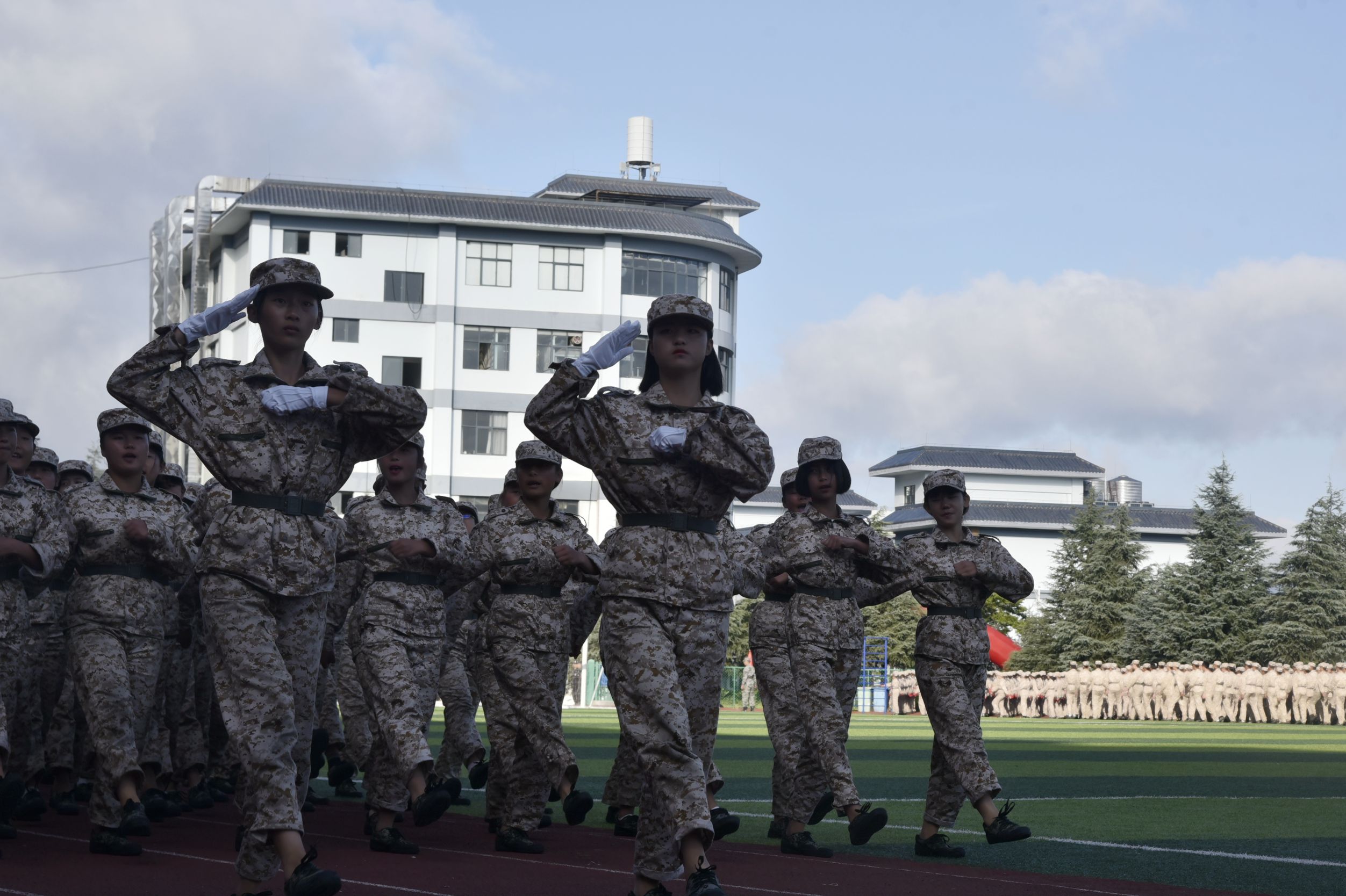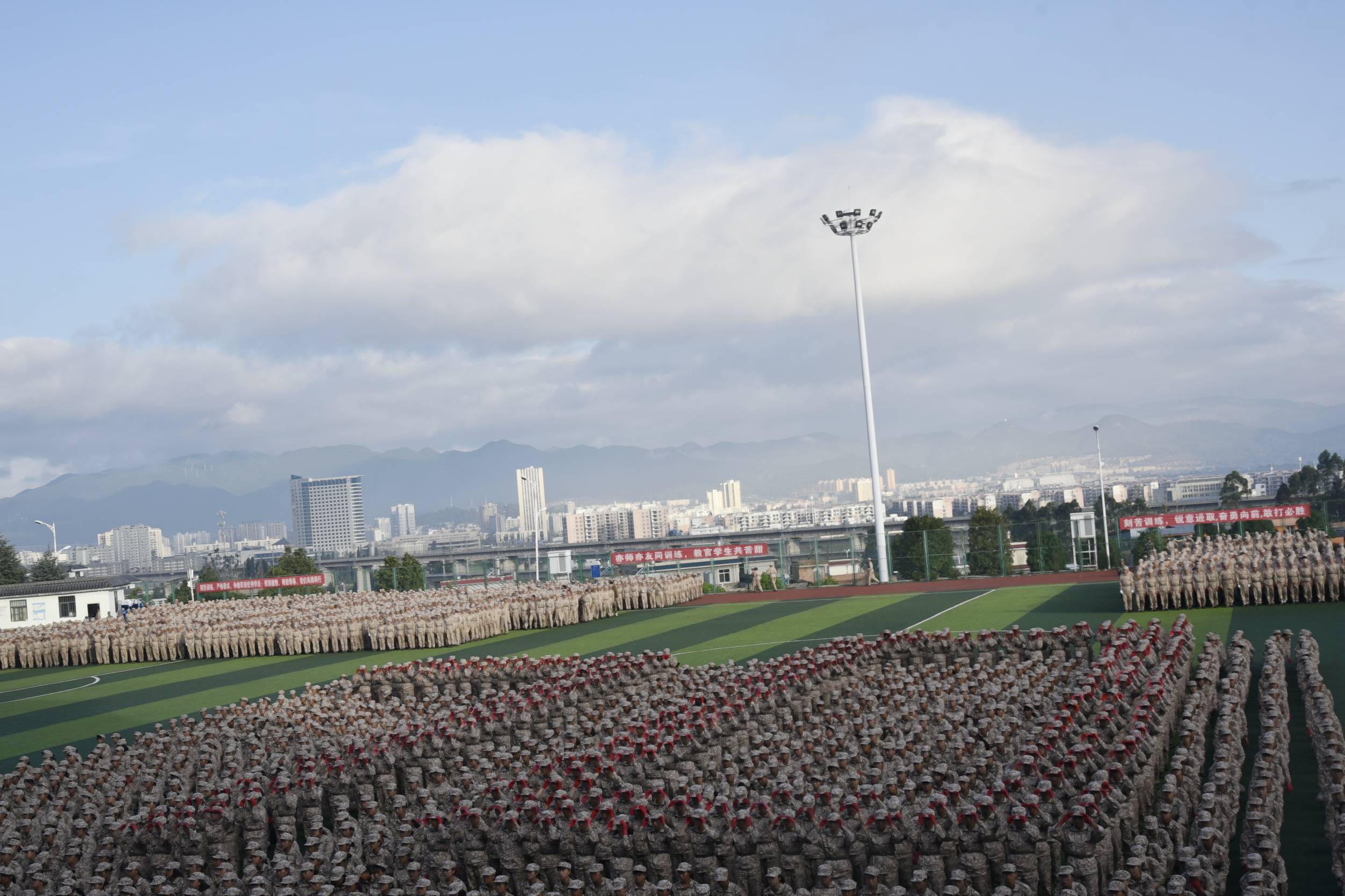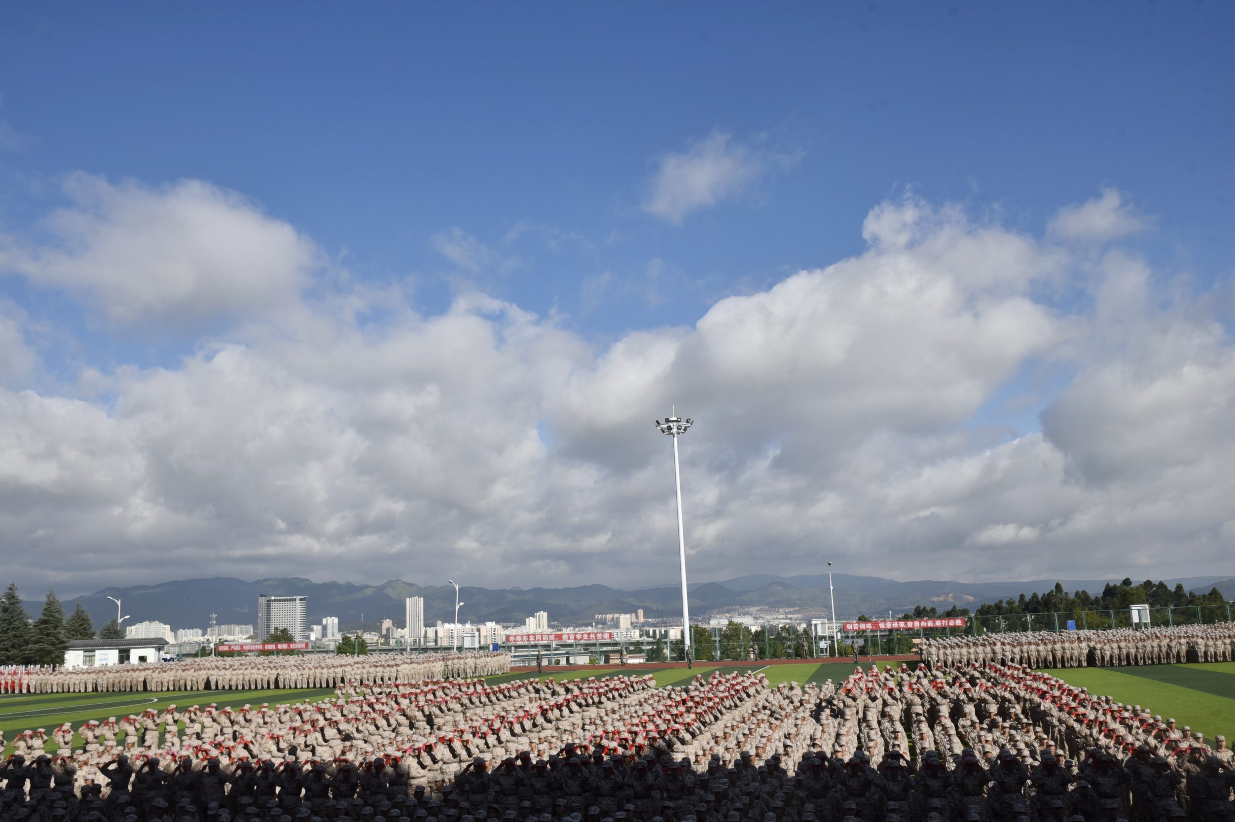 天高云阔,风语如歌。学院党委书记龙正昌在党委委员、副院长周平的陪同下检阅了新生军训方队。运动场上,2019级新生们口号洪亮,士气高昂,精神抖擞,充分展示了昆卫学子积极向上、拼搏进取的精神面貌。