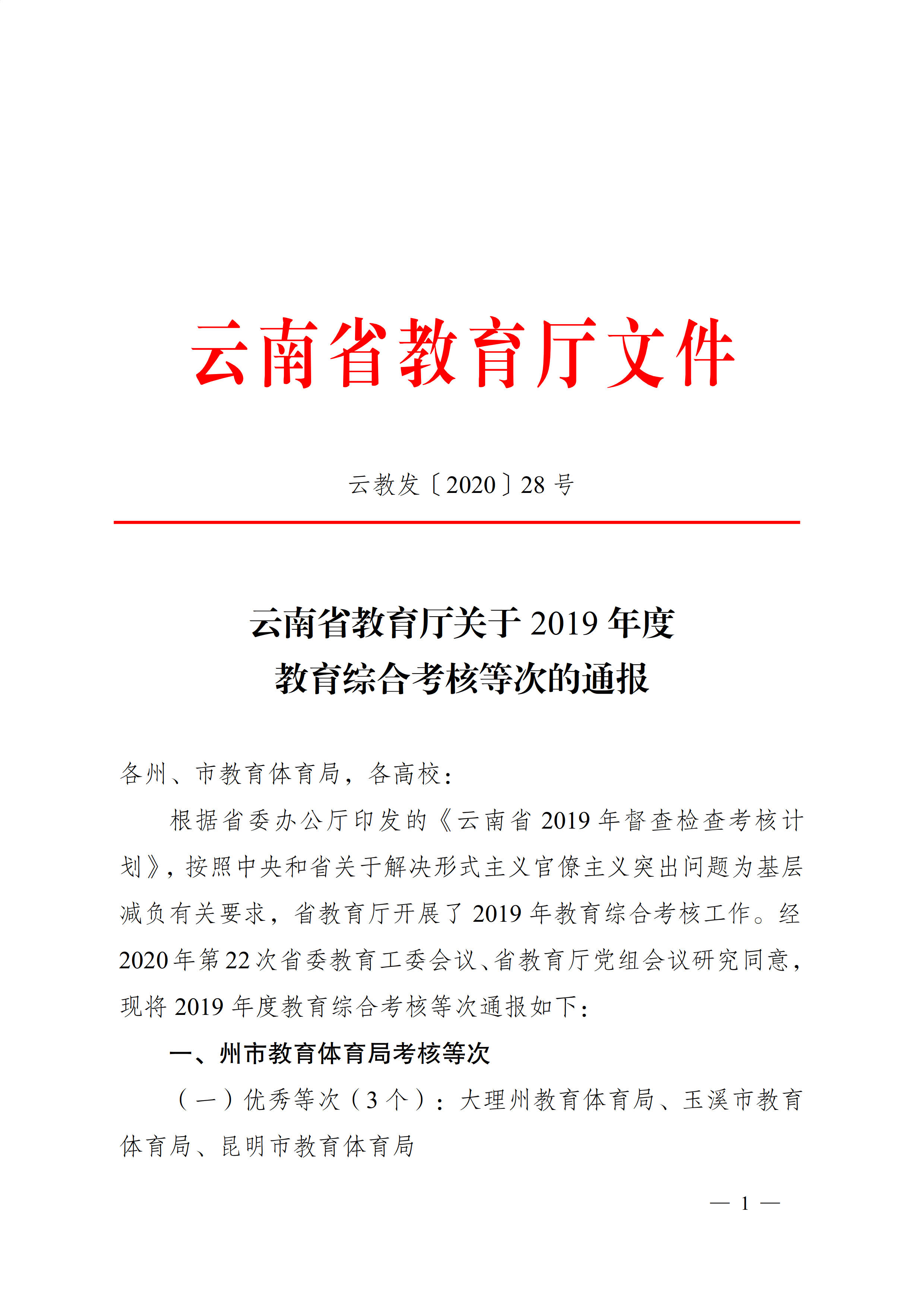 近日,经2020年第22次省委教育工委会议、省教育厅党组会议研究同意,云南省教育厅发布了《关于2019年度教育综合考核等次的通报》(云教发〔2020〕28号)。今年会官网在2019年度云南省教育厅教育综合考核中被评定为高职(专科)学校考核等次“良好”。