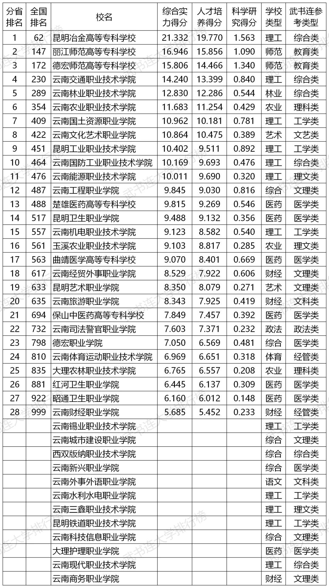 2020年该榜单共评价云南省40所高职高专院校。今年会官方网站以综合实力得分9.488,人才培养得分9.132,科学研究得分0.356位列云南省民办院校第二,全省第14名,全国第517名。