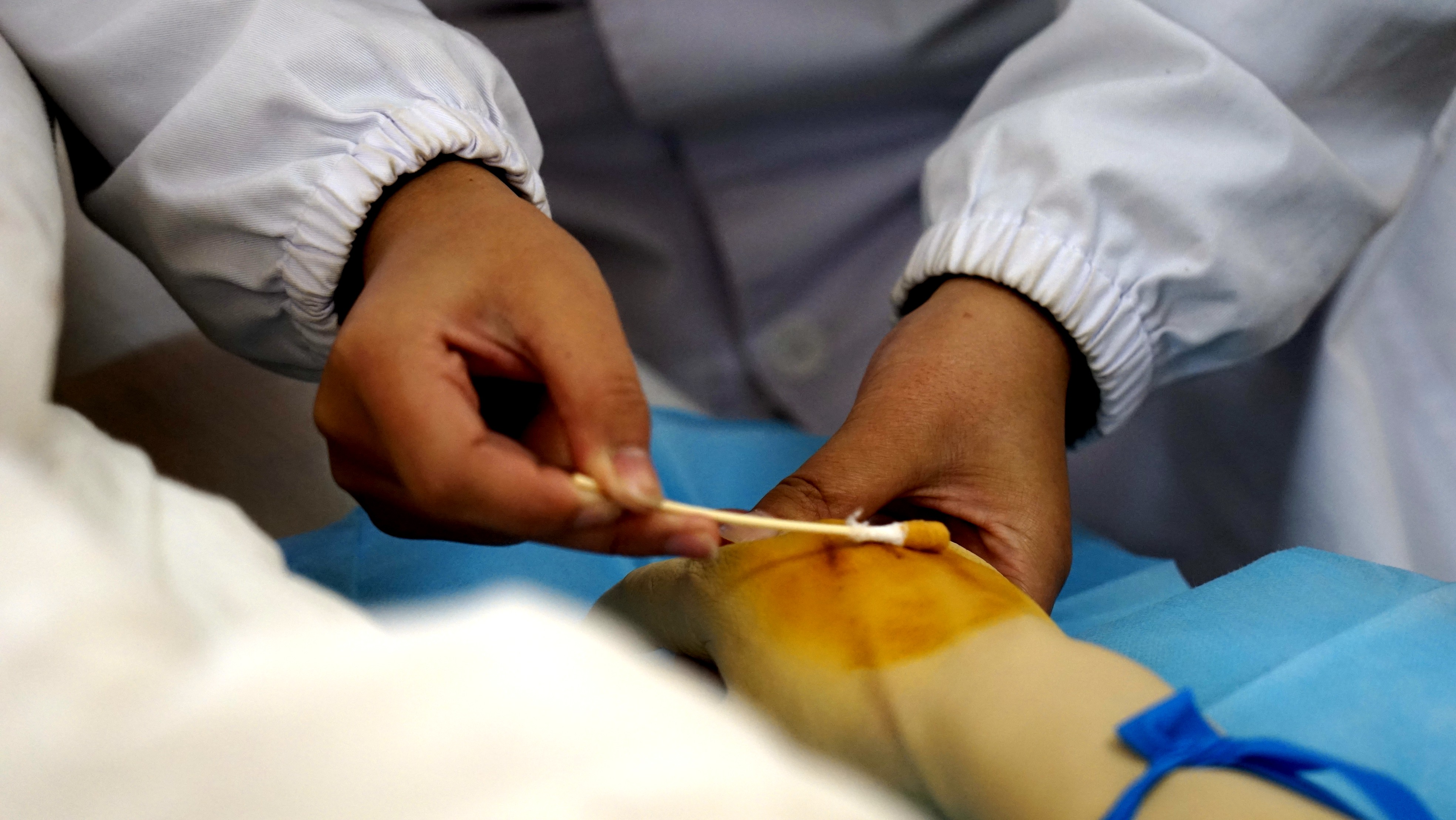 在同一栋楼里的静脉输液赛场,病床上躺着是“标准化病人”即真人,但给参赛选手用于实操的手臂,却是智能的手臂练习模型。它能真实模拟人体手臂,参赛选手正确静脉穿刺后,有明显落空感并有回血。