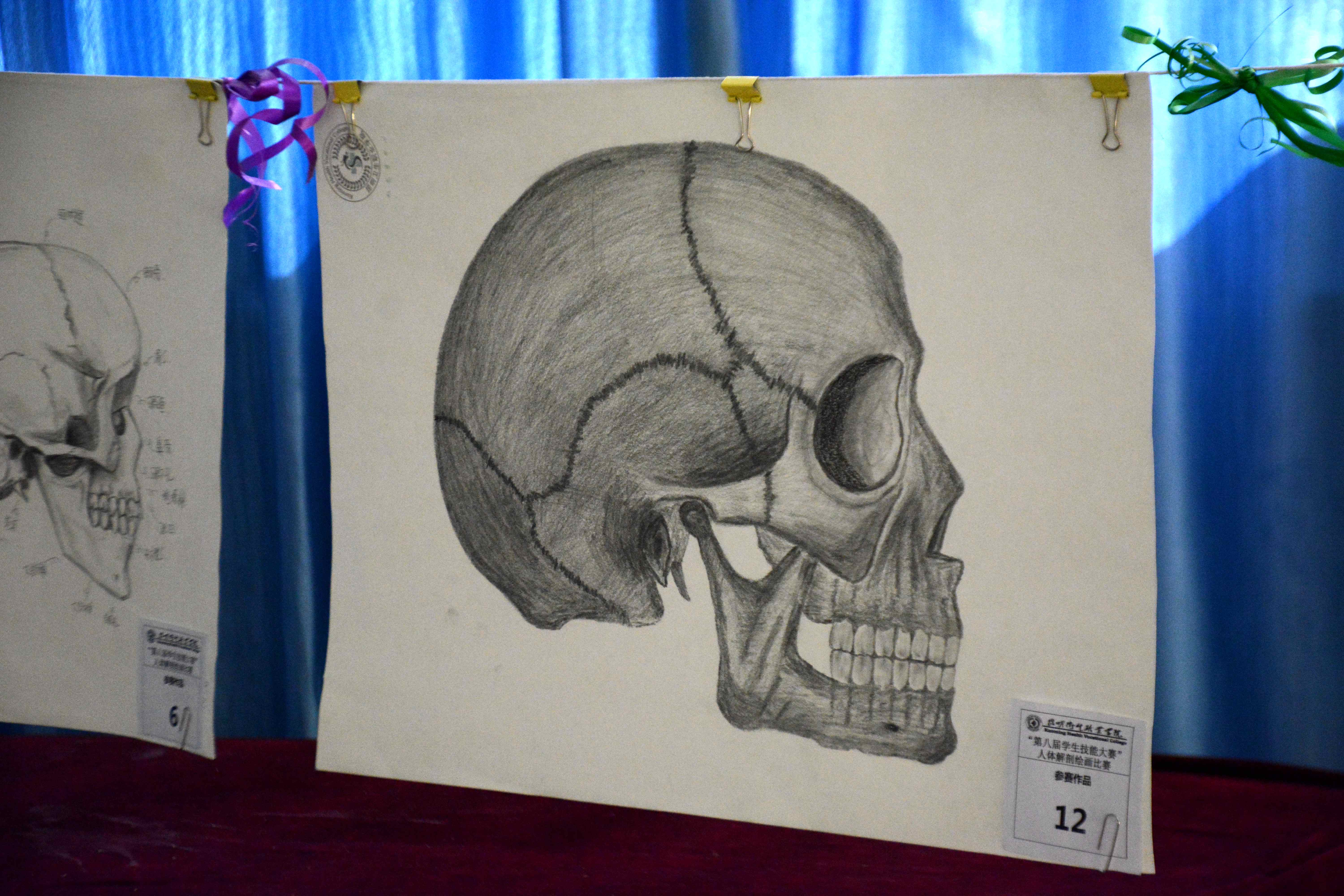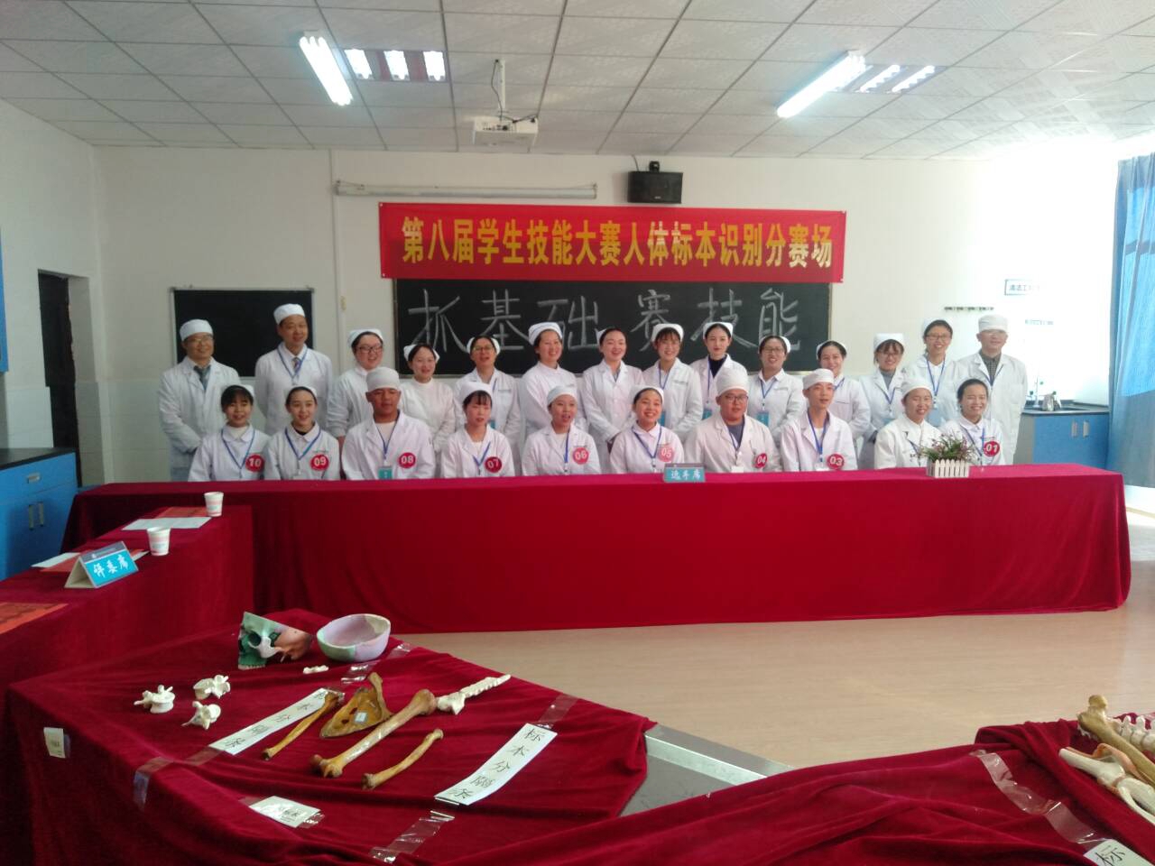 本届技能大赛共有护理、临床、中医、检验等13个大类赛项,涉及中医知识竞赛、中药材识别与调剂、影像诊断技术、革兰染色及镜检、磨牙雕刻、人体解剖标本识别等多个比赛项目,几乎全员学生参与其中。