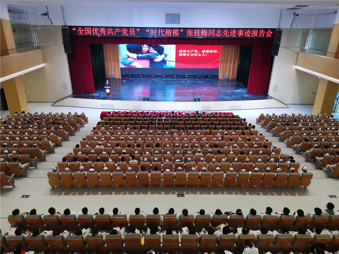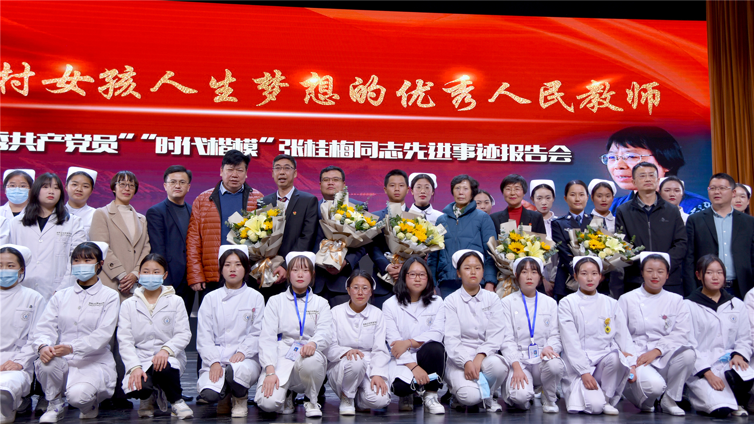 会上,全体参会人员奏唱国歌,学院华坪籍学生代表为报告团成员献上鲜花。张桂梅同志先进事迹报告团5位成员依次作宣讲报告。