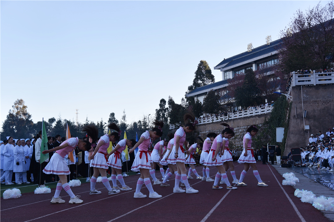 学院啦啦操校队展演后,护理学院进行了千人啦啦操比赛。