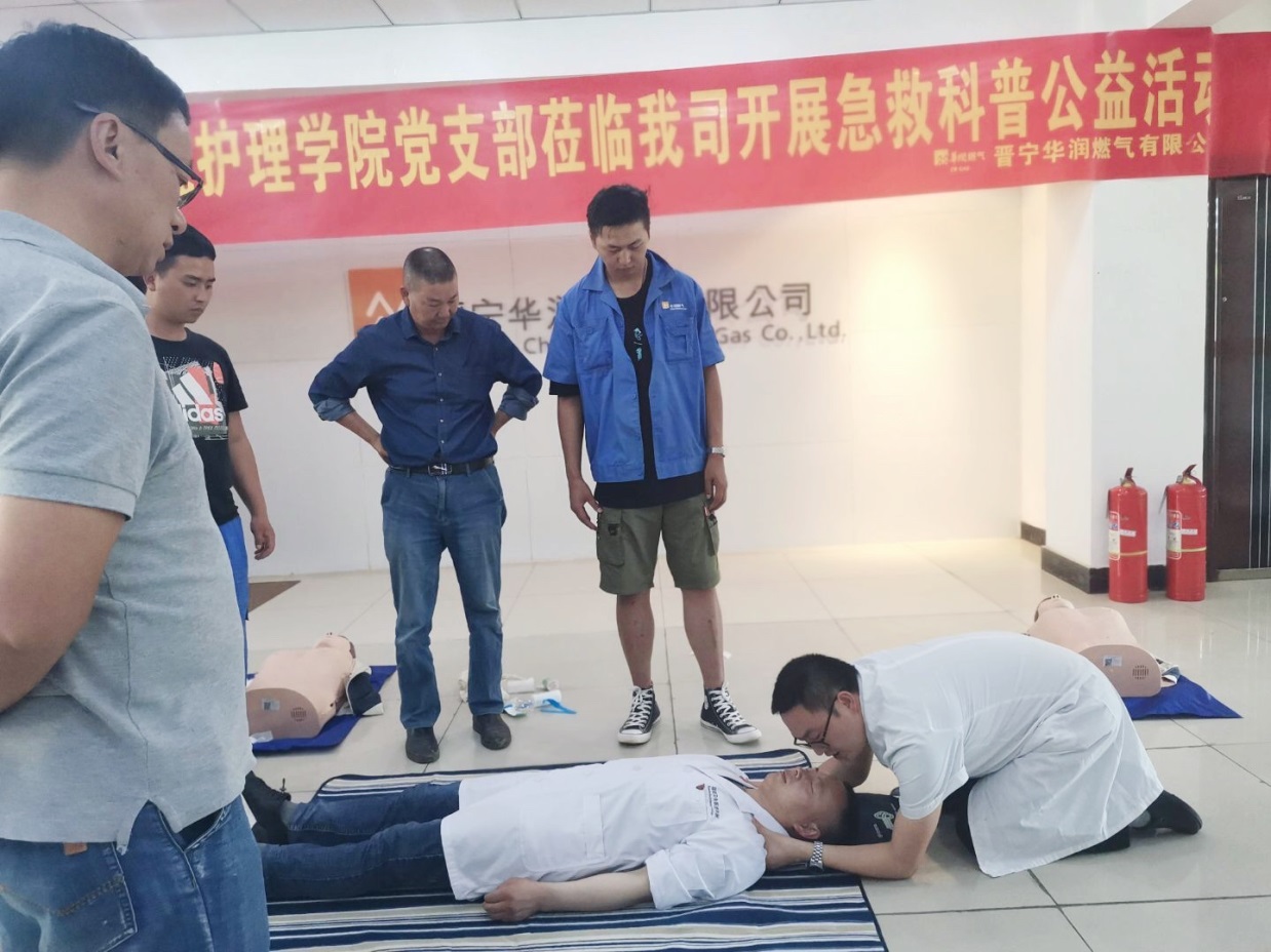 科普宣传进企业,急救知识入人心。5月28日,护理学院党支部到晋宁华润燃气有限公司开展急救科普公益活动,为公司员工介绍了紧急抢救措施、心肺复苏、异物梗阻急救、触电及溺水院外紧急救护等内容。围绕急救处理的基本知识,对抢救方法和操作过程以及急救过程中存在的注意事项等内容做了重点讲解,并让公司员工进行心肺复苏的现场操作演练,对演练中存在的问题和注意事项进行逐一指导,增强自救互救能力。
