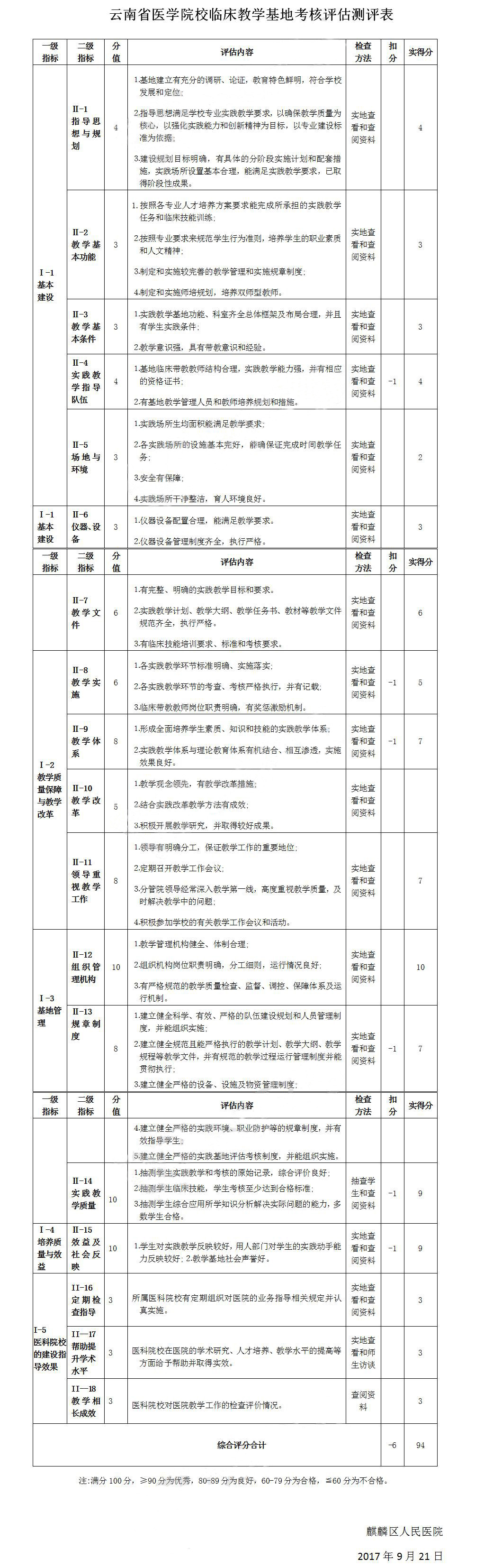 【云南省2017年附属医院评估工作】麒麟区人民医院自评表