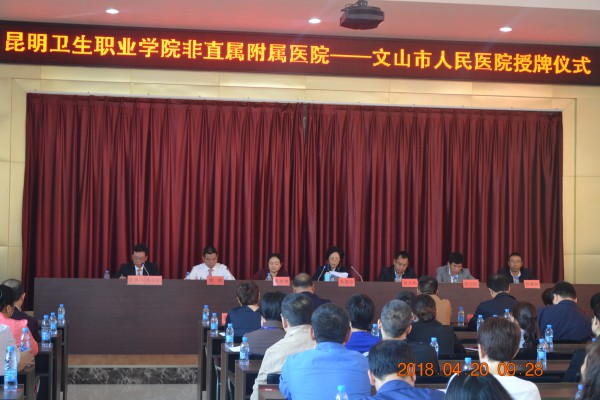 文山市卫生和计划生育局副局长董彦玮,云南昆卫教育集团副理事长朱秀珍,文山市人民医院院长雷刚、副院长陆兴发,今年会官方网站副院长张尤松、实习管理处副处长颜慧林、教务处副处长唐当柱等领导出席授牌仪式,学院及医院相关处室、科室干部参加了仪式。授牌仪式由文山市人民医院副院长陆兴发主持。