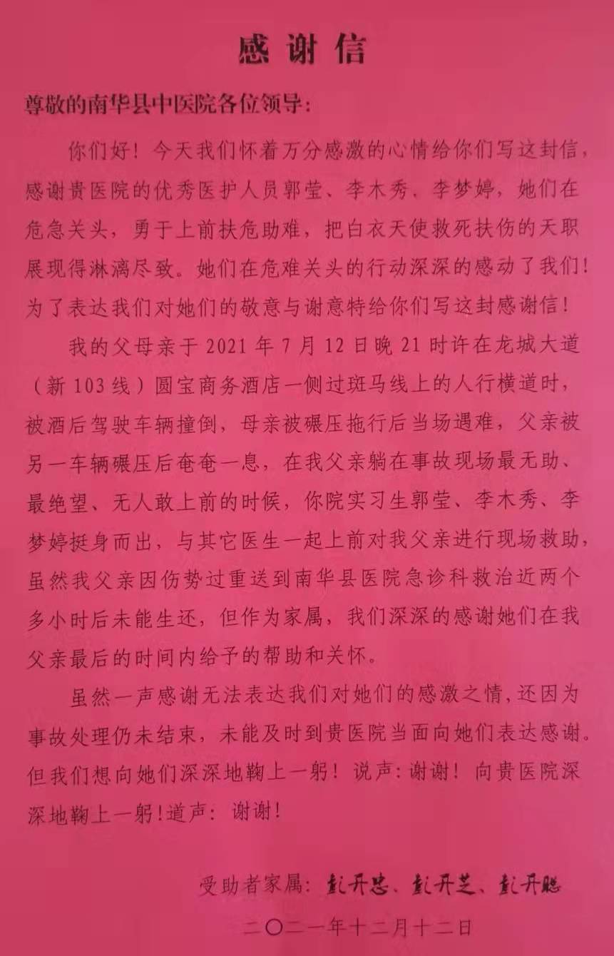 2021年7月12日,南华县中医医院实习生:郭莹(2017级护理1班)、李木秀(2017级护理17班)、李梦婷(2017级护理17班),在回医院途中,看到一位因车祸受伤的老人躺在路上痛苦挣扎,围观群众无人敢于上前救助,三人见状快速赶到伤者身边进行紧急救助,待120急救人员到来后即时将伤者送上救护车。