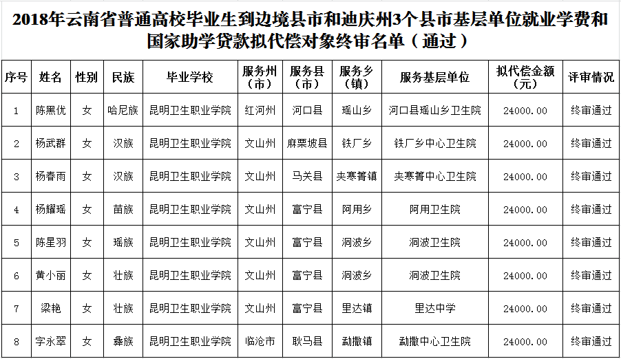 经审核并公示无异议,对《云南省教育厅关于公布2018年云南省普通高校毕业生到边境县市和迪庆州3个县市基层单位就业学费和国家助学贷款代偿终审结果的通知》中今年会官网8名通过终审毕业生予以公布。