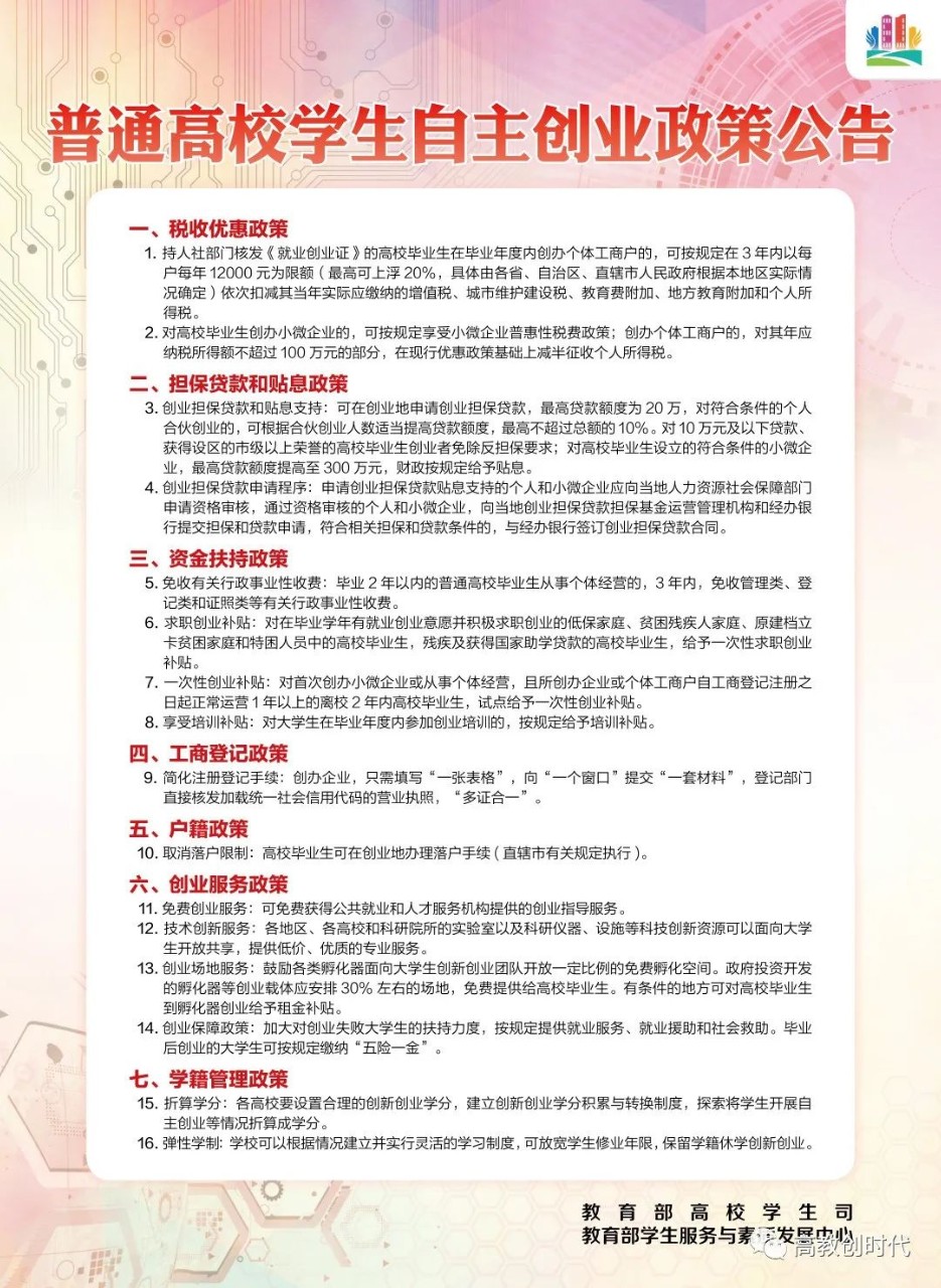 14.创业保障政策:加大对创业失败大学生的扶持力度,按规定提供就业服务、就业援助和社会救助。毕业后创业的大学生可按规定缴纳“五险一金”。