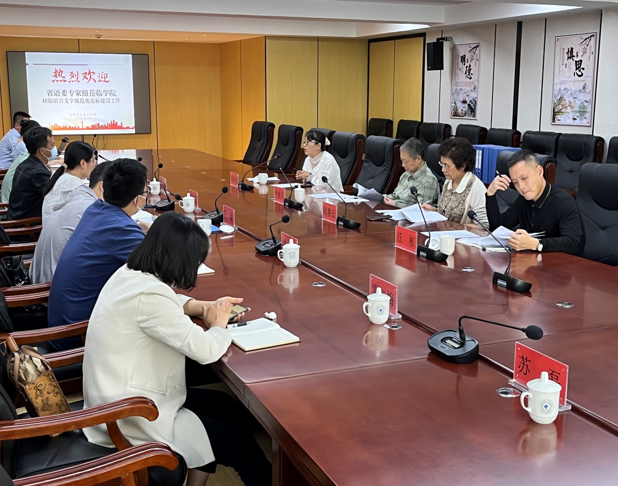 随后,专家组实地巡检了校园标牌、宣传栏及公文用语用字规范化情况,认真查阅了语言文字规范化工作台账,并与学院语委委员进行了座谈交流。