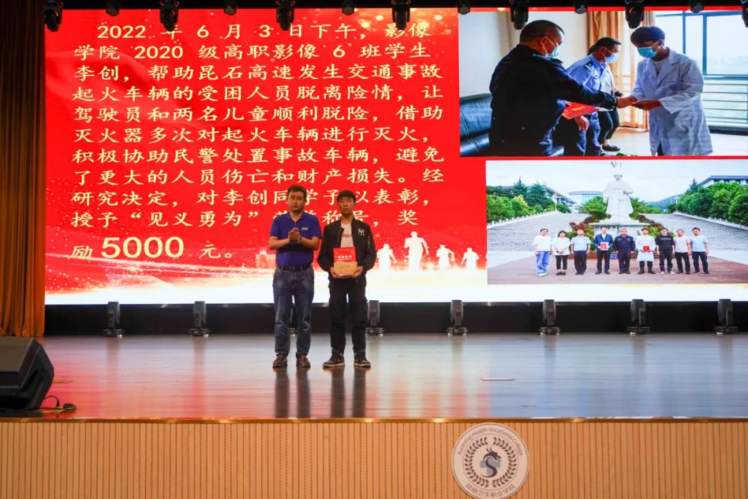 随后,学院对6月3日下午帮助昆石高速发生交通事故起火车辆的受困人员脱离险情,让驾驶员和两名儿童顺利脱险的2020级高职影像6班李创同学授予“见义勇为”荣誉称号,并奖励5000元。
