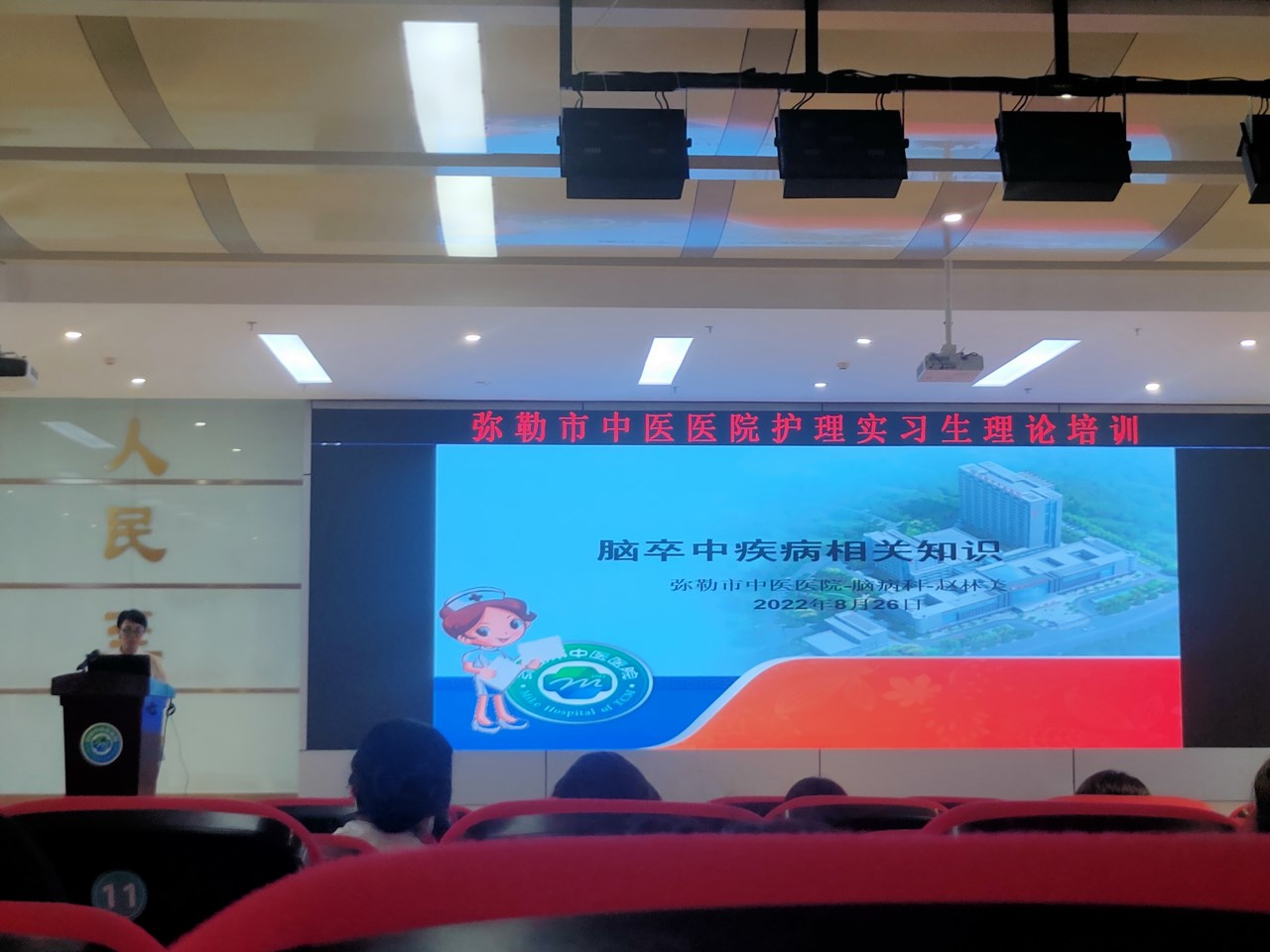 8月26日上午,所有实习学生在弥勒市中医院5-12报告厅参加了培训。本次培训的主要内容是《脑卒中疾病相关知识》,理论与临床相结合讲述了脑卒中的典型症状,高血压的危害,怎样预防,脑卒中患者的护理措施等等。整个过程在认真、活跃的氛围中度过,有效提高了我们实习生的医学理论水平,增强了理论联系实际的能力。我们从中收获不少,学到了很多书本以外的知识,期待下次培训。