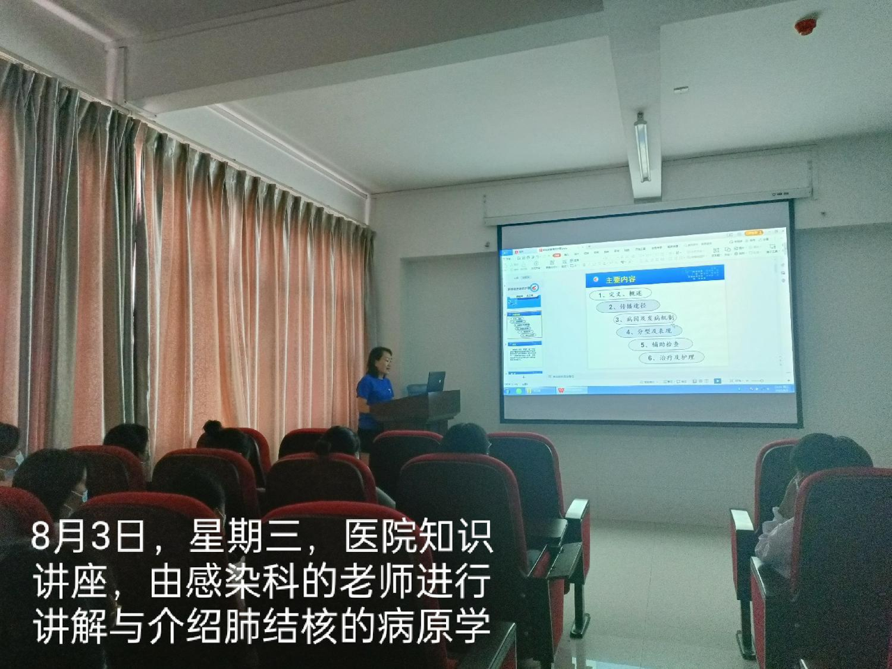在紧张忙碌的工作之余,感染科老师抽空给我们进行了《肺结核的病原学知识》讲座,介绍了肺结核的常见症状,如(咳嗽、咳痰、咯血、胸闷、低烧、乏力)等,及结核病防治措施的相关知识。通过老师的分享,我们再一次重新认识了肺结核疾病,肺结核并不可怕,它是可以防治和治愈的。感触最深的是临床中的护理,大家须正确认识肺结核,积极主动做好防御工作。