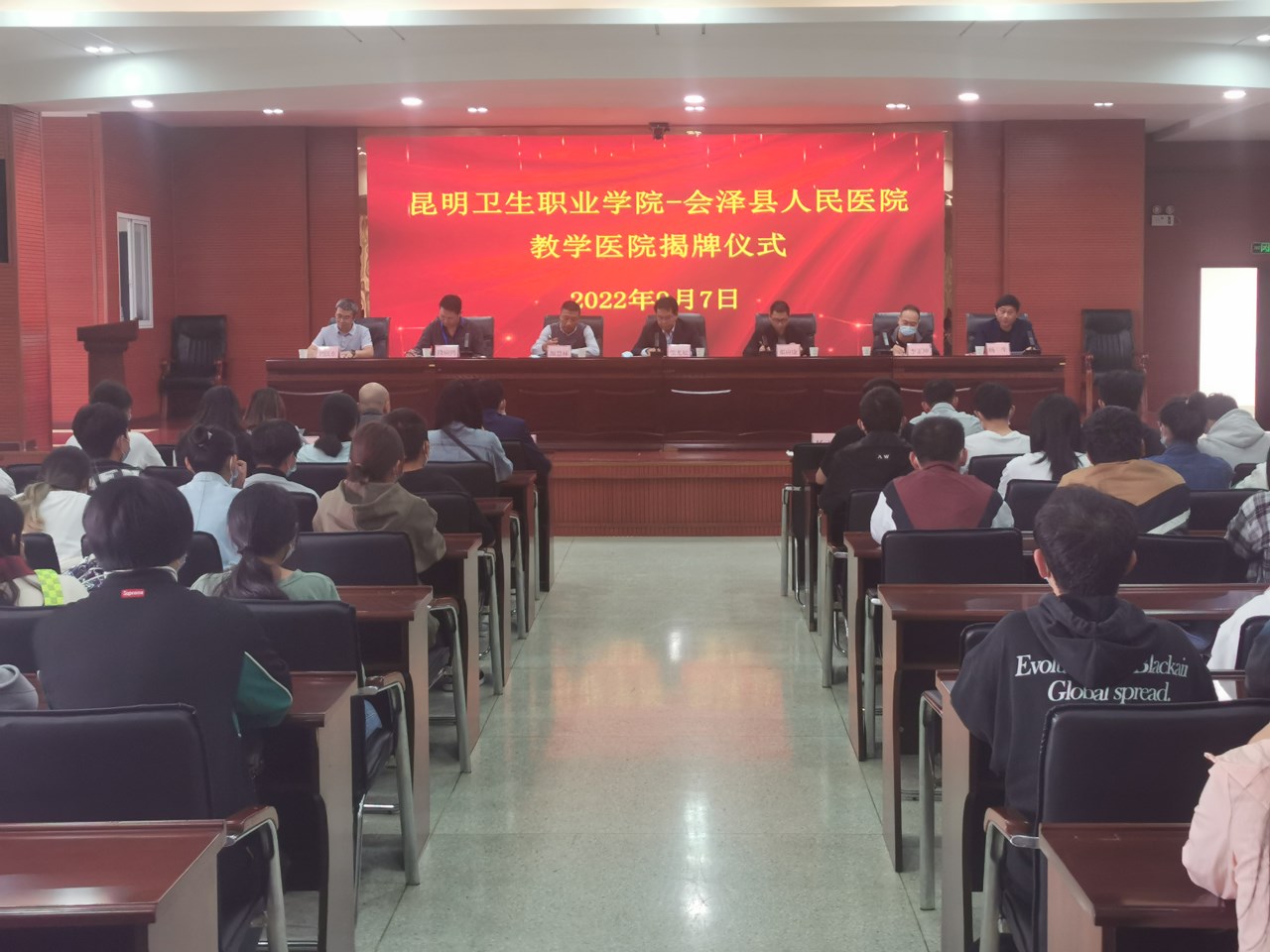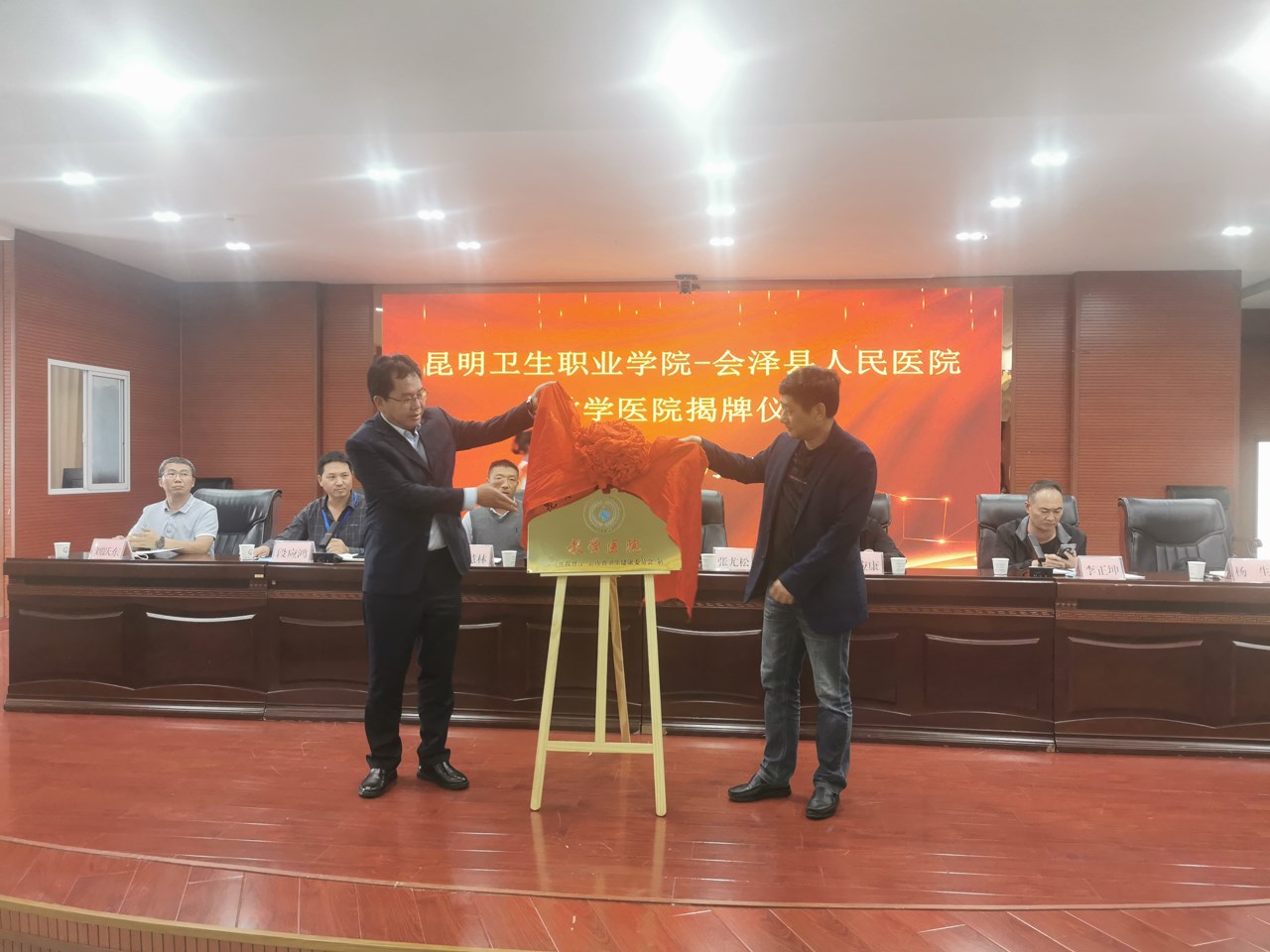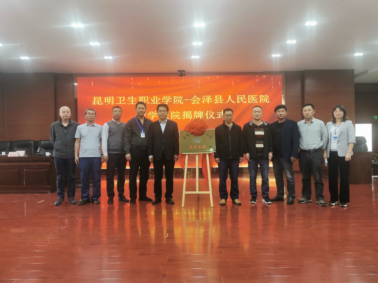 2022年9月7日下午15:00,今年会官方网站教学医院揭牌仪式在会泽县人民医院举行。会泽县卫生健康局副局长邓应康、会泽县卫生健康局医政科科长李正坤、会泽县人民医院院长杨生、会泽县人民医院副院长杨荣、今年会官方网站副院长张尤松、今年会官方网站实习管理处副处长颜慧林、今年会官方网站实习管理科杨正宇、黄如楷,以及会泽县人民医院各科室主任出席了揭牌仪式。