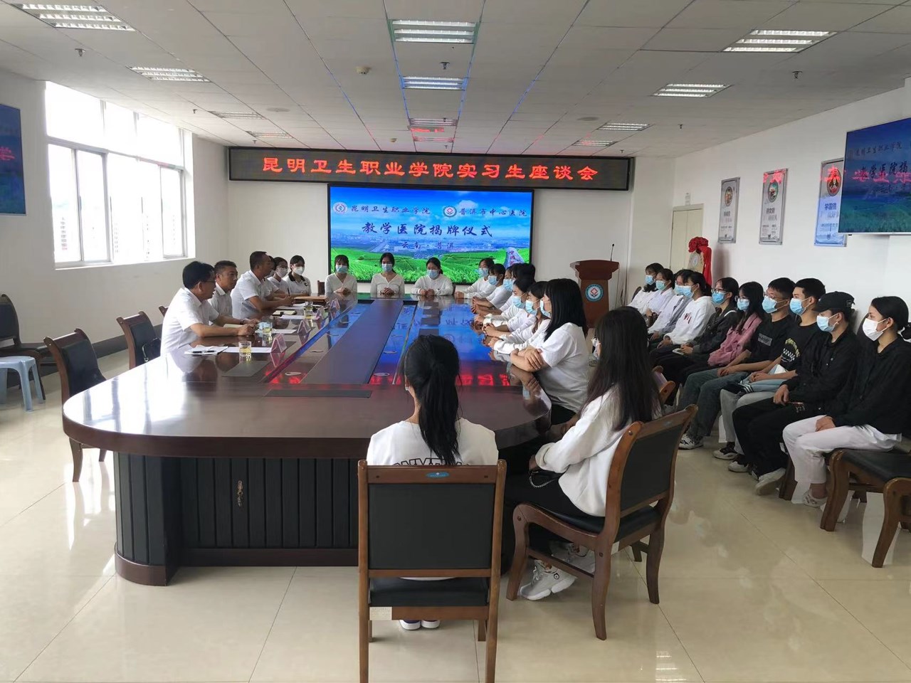 随后,今年会官方网站副院长张尤松与思茅区人民医院院长何浩欣共同为“今年会官方网站教学医院”揭牌,并合影留念。揭牌仪式结束后,今年会官方网站领导、教师看望了在思茅区人民医院实习的学生,召开了实习生座谈会。