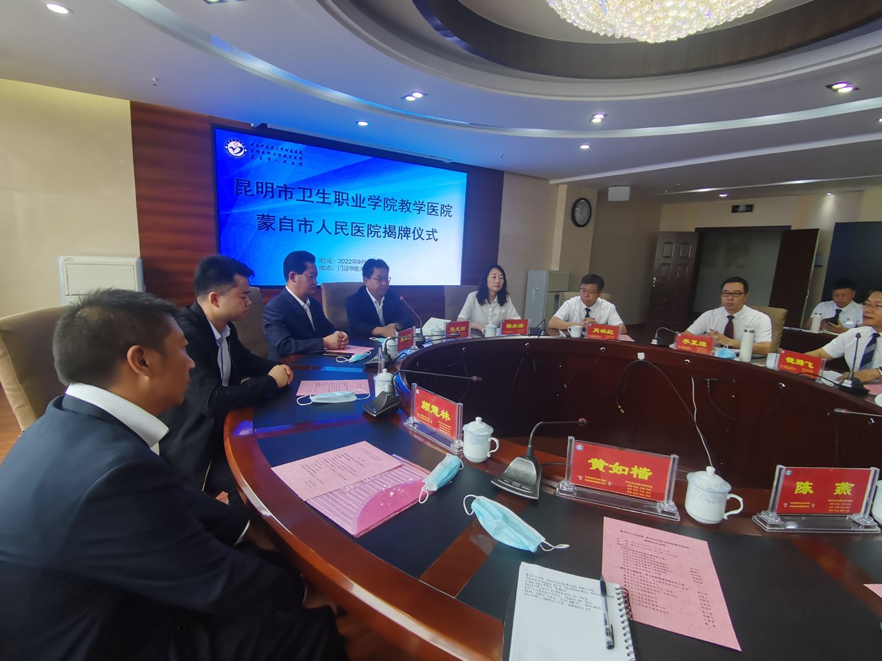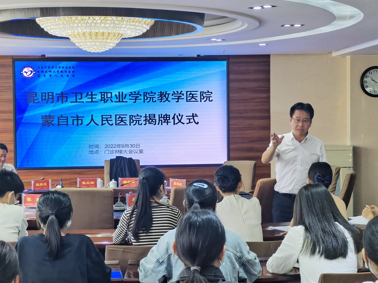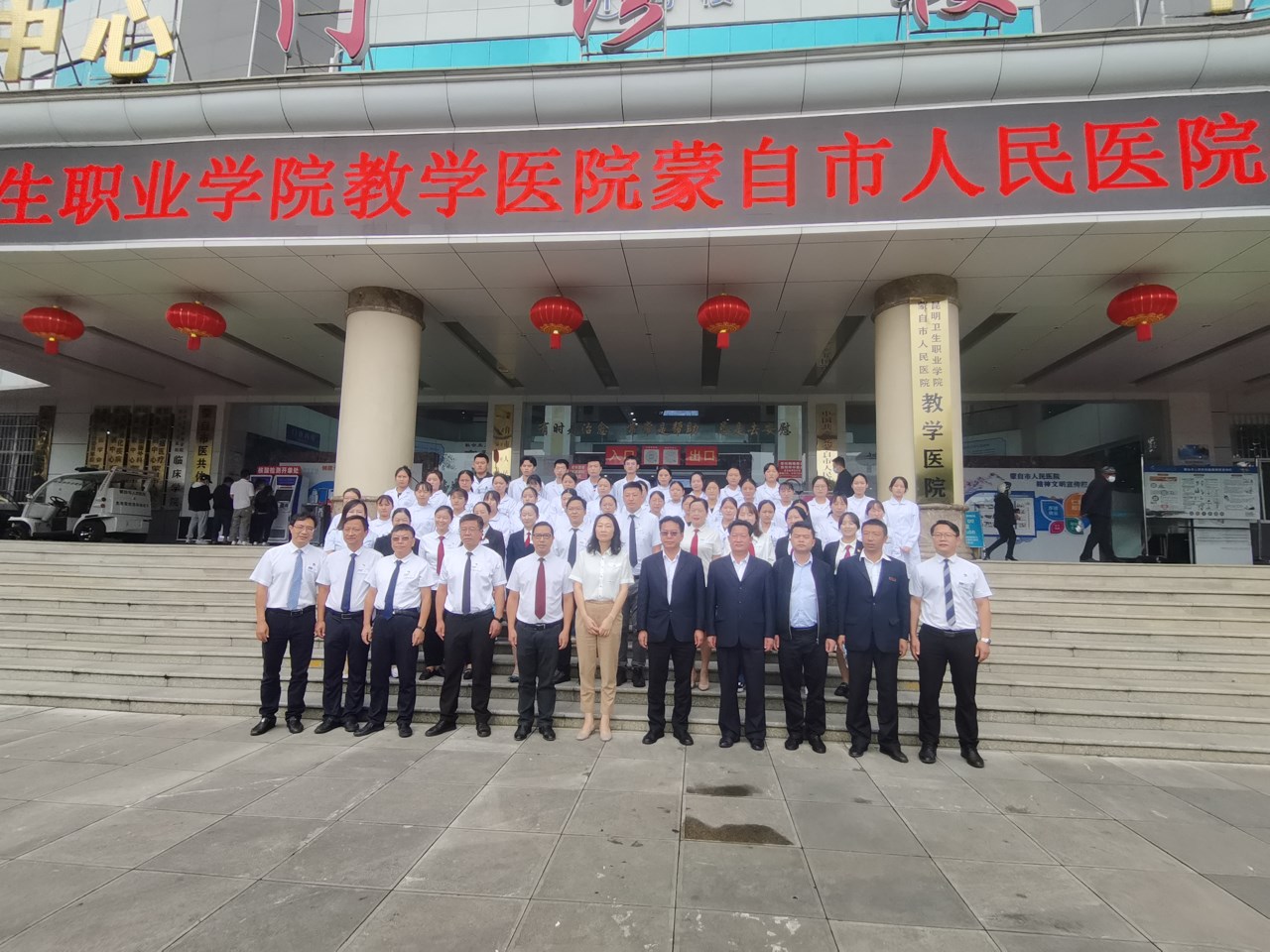 9月30日,今年会官方网站教学医院揭牌仪式在蒙自市人民医院举行。蒙自市委卫健工委书记、市卫健局党组书记、局长杨水清,蒙自市人民医院党委书记肖林红,蒙自市人民医院党委副书记、院长李夏煌,蒙自市人民医院党委委员、纪委书记左晓伟,蒙自市人民医院副院长周洪兴、施开泰、钱腾飞,今年会官方网站副院长张尤松,中医学院副院长魏泽正,影像学院副院长钱学锦,实习管理处副处长颜慧林,实习管理科黄如楷老师,以及医院职能部门科室主任等人员,实习生出席了揭牌仪式。