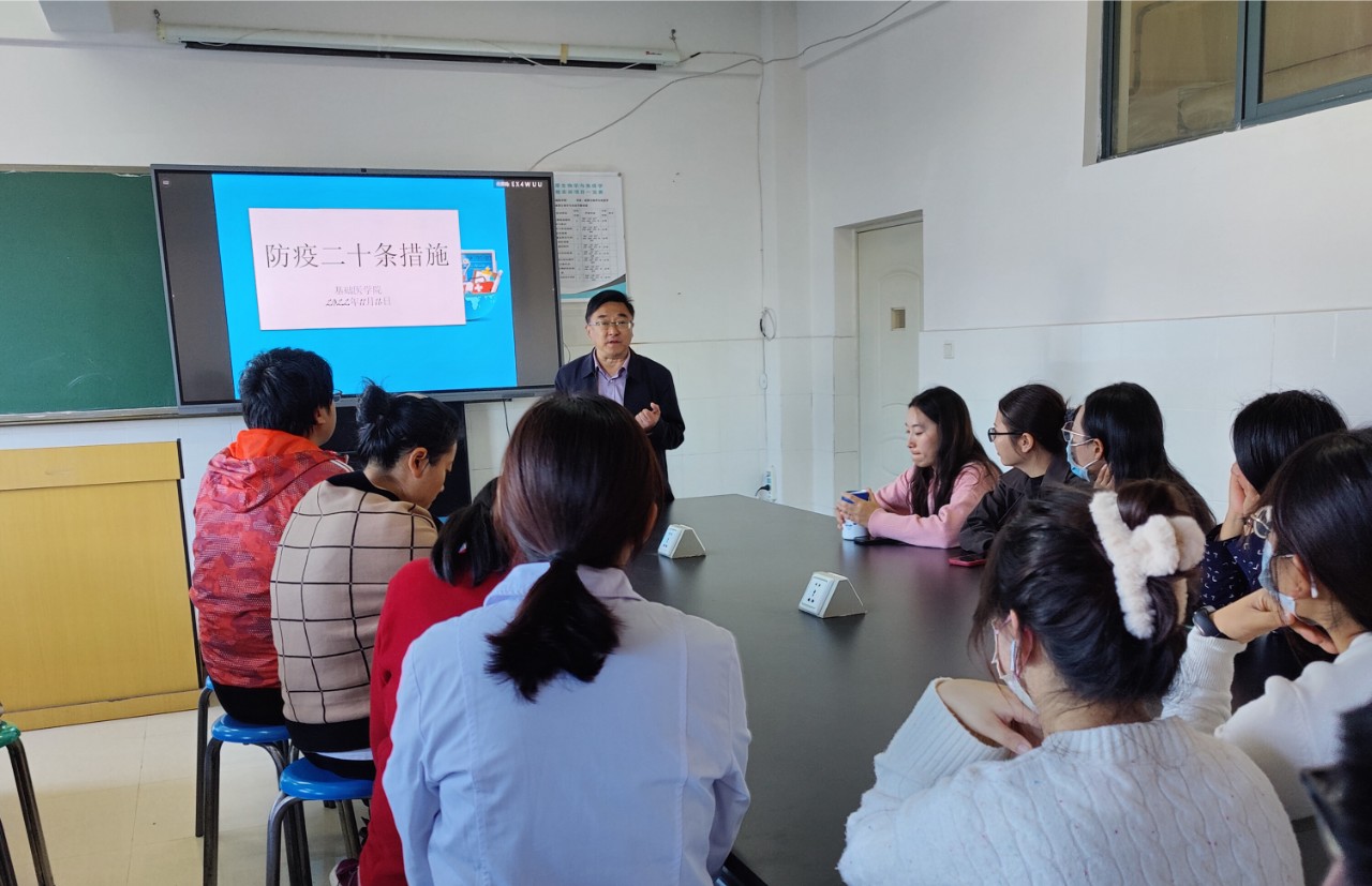 基础医学院院长武煜明带领全体教师进行集中学习,要求全体教师全面准确了解防控政策,从自身做起,进一步织密织牢校园常态化疫情防控,坚决巩固来之不易的防控成果。党支部书记李睿雯带领基础医学院疫情防控工作组,对疫情防控工作进行了全面检查,并对检查中发现的问题进行了整改。