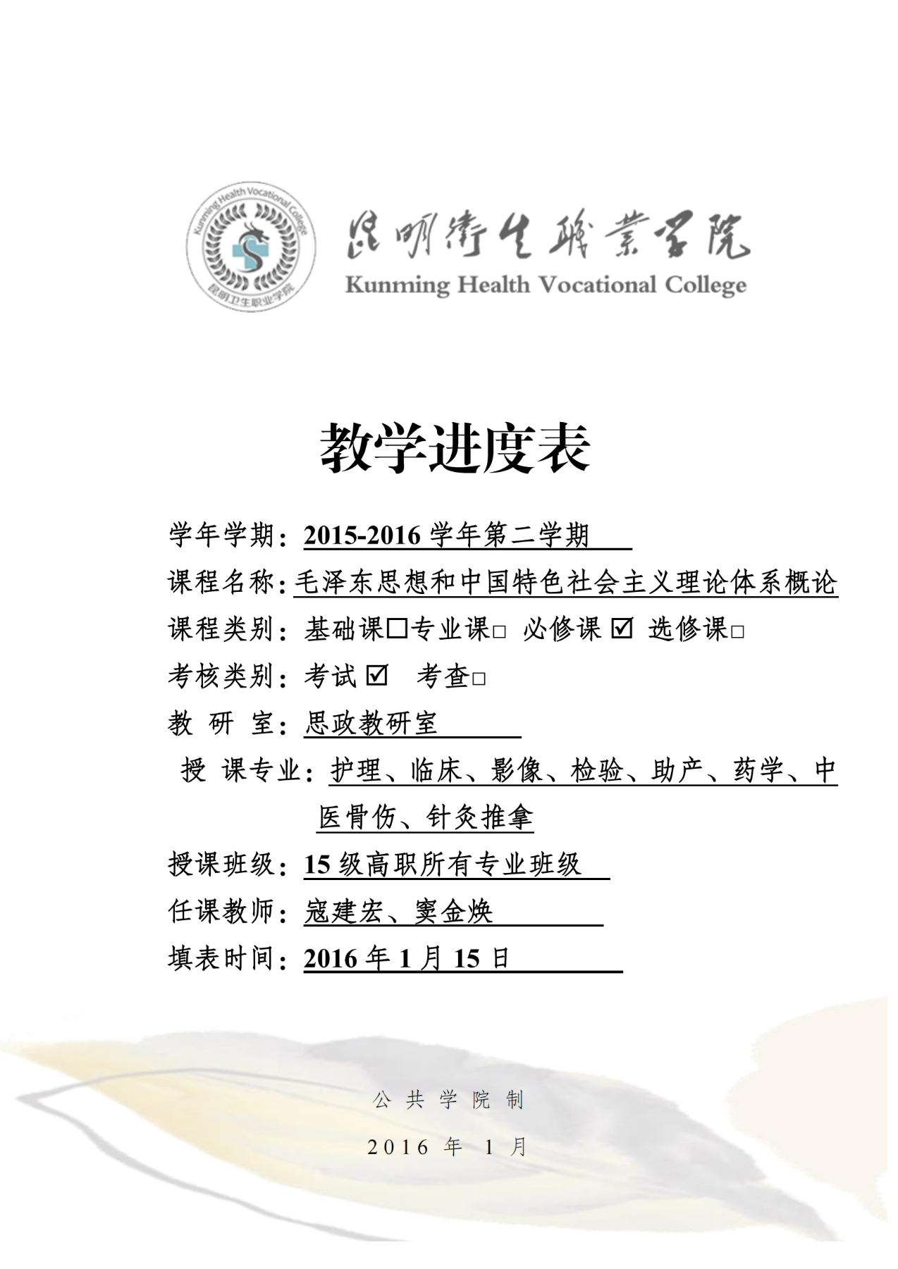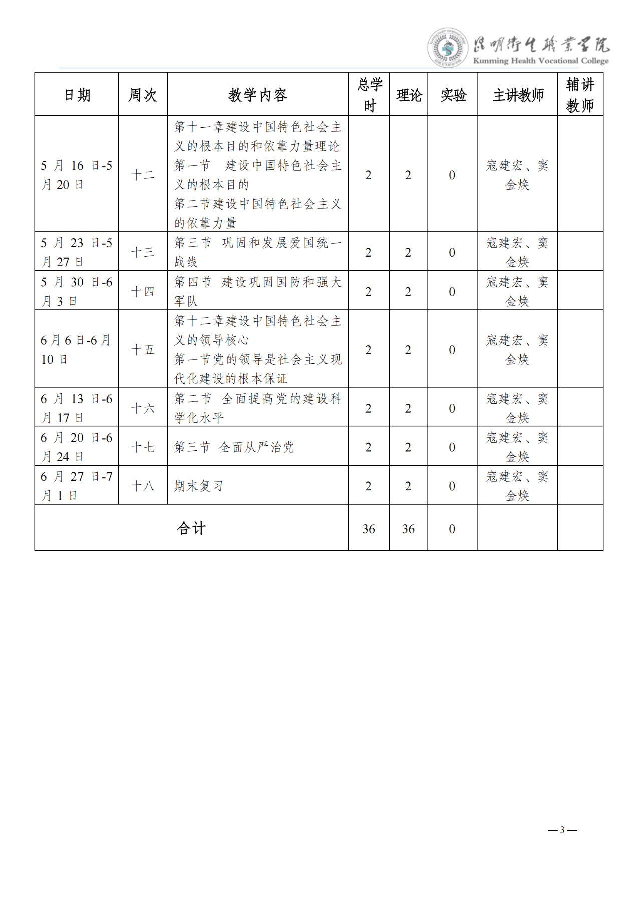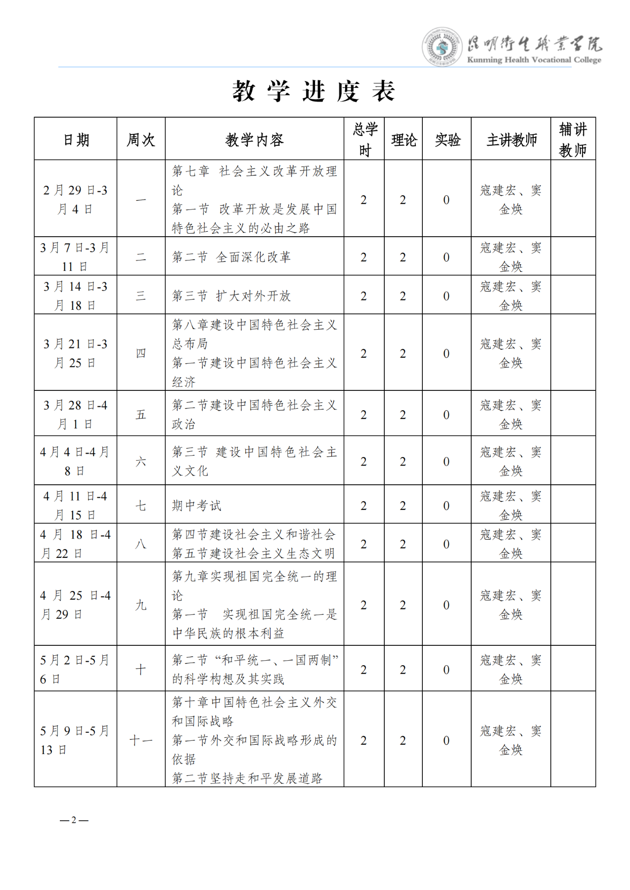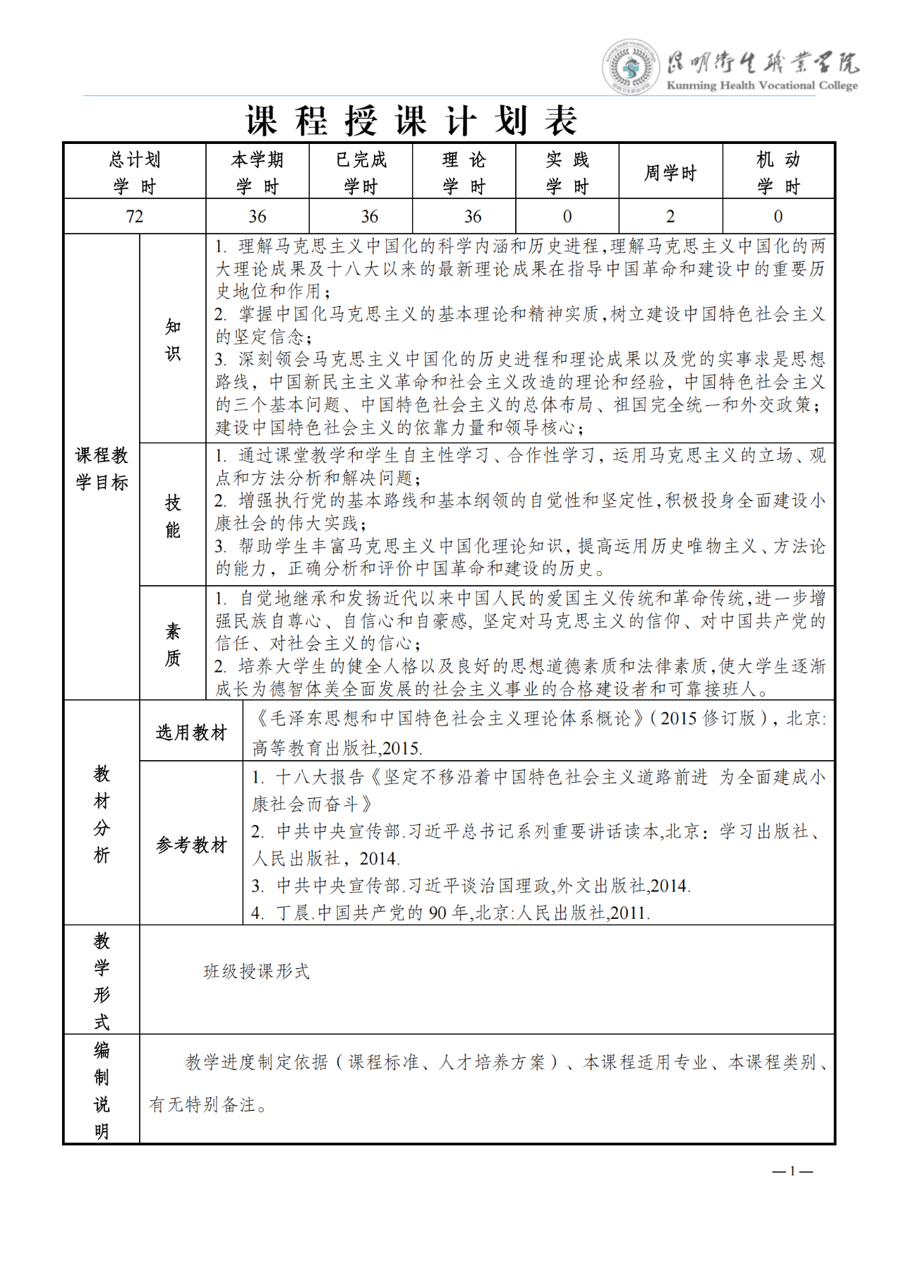 《毛泽东思想和中国特色社会主义理论体系概述》教学进度表