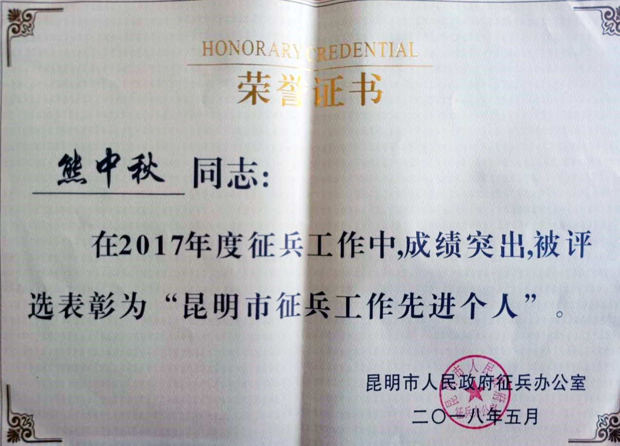 2017年云南省征兵办公室下发学院全年征兵任务17人,入伍人数26人,学院人民武装部人武科科长熊中秋同志被昆明市人民政府征兵办公室评为昆明市先进征兵个人。