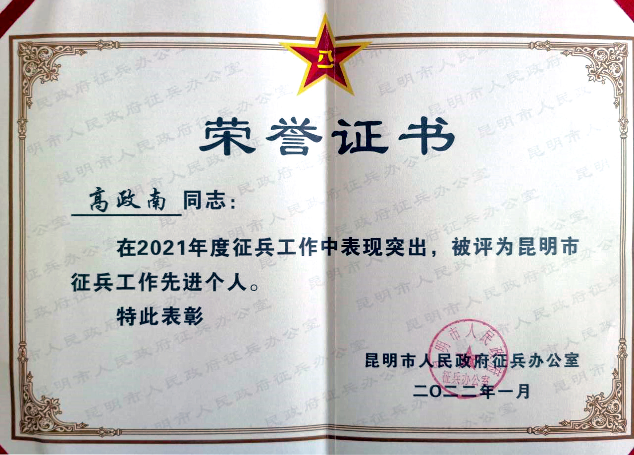 2021年云南省征兵办公室下发学院全年毕业生任务数24人,入伍人数126人(毕业生84人,在校生44人)。学院被昆明市人民政府征兵办公室评为昆明市先进征兵单位。学院人民武装部副部长高政南同志被昆明市人民政府征兵办公室评为昆明市先进征兵个人。