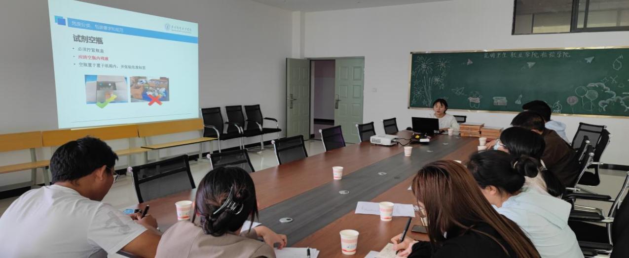 2023年6月13日,教务处根据检查情况组织实验室安全检查总结大会。首先对安全检查情况进行总结,针对危废分类、包装要求和规范、特种设备安全管理、气瓶存放基本原则、加热设备安全管理、化学品安全存放基本原则、危化品存放要求、洗眼器的检查要求这个七个方面组织了培训,并完成培训考核。其次,组织了实验室管理交流会,由临床学院(检验专业)进行实验室管理分享。
