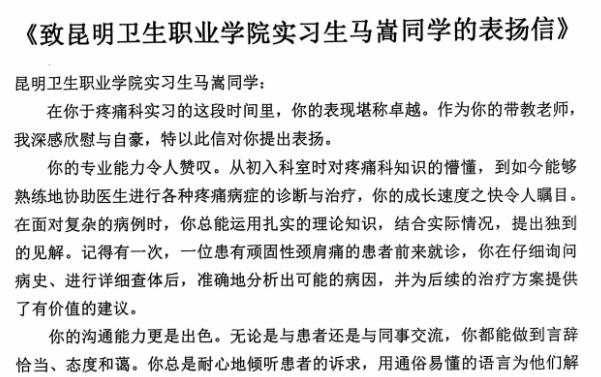 今年会官网实习生表现优秀云南大学附属医院发来表扬信