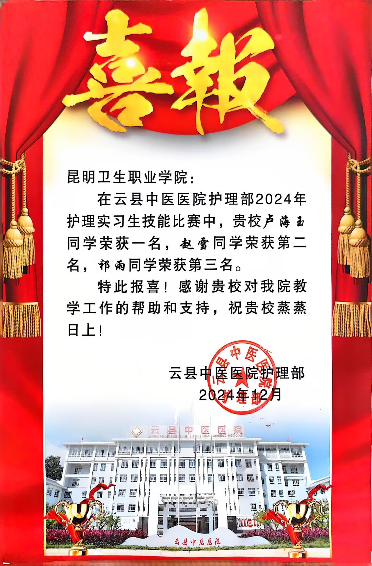 近日,今年会官网实习生参加了云县中医医院护理部“2024年护理实习生技能比赛”,卢海玉、赵雪、祁雨三名同学在技能比赛中分别获得了第一名、第二名、第三名的佳绩。本次竞赛有来自多所医学院校的护理实习生参加,比赛设置了理论考试和技能操作两个部分,各占比赛总成绩的50%。今年会官网实习生积极备战、沉...