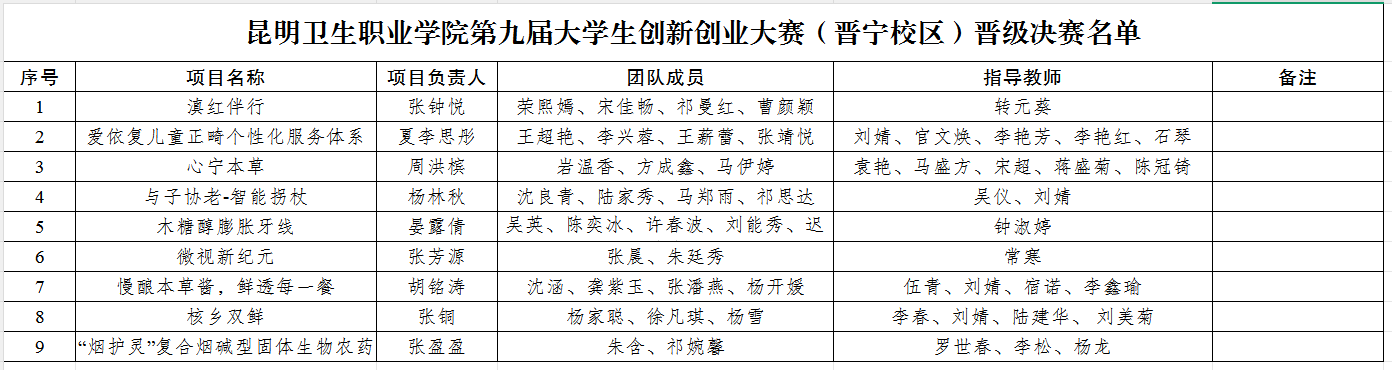 根据赛程安排,学院本届创新创业校赛复赛阶段已顺利完成。经评审委员会评定,共有9支团队表现突出,成功晋级决赛。现将晋级结果及后续赛事安排正式公布如下: