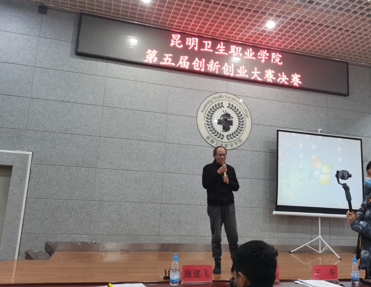 在总决赛现场,昆明市人力资源和社会保障协会大学生创业服务中心主任、云南省教育厅创新创业专家评委、昆明市科技局创新创业梦想十佳导师钟健文老师讲话,介绍了举办此次活动的目的和意义,强调了创新创业大赛的重要性,对参赛团队给予了期望与鼓励。